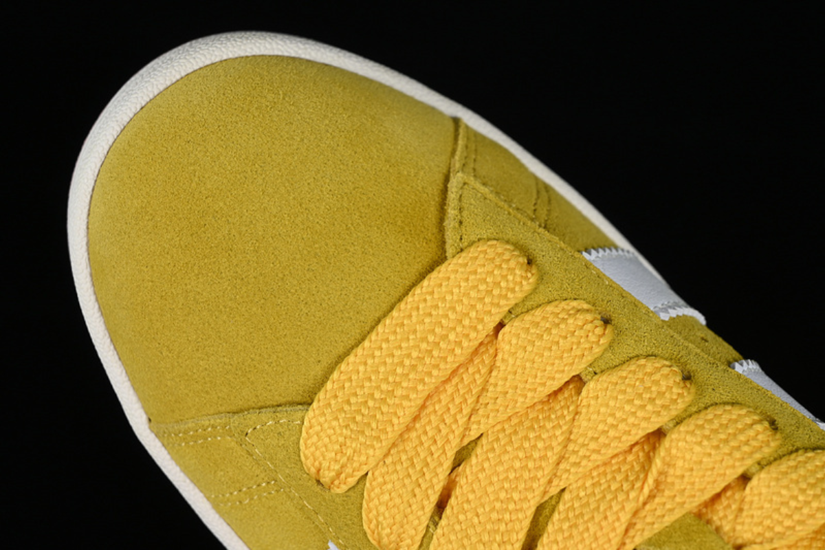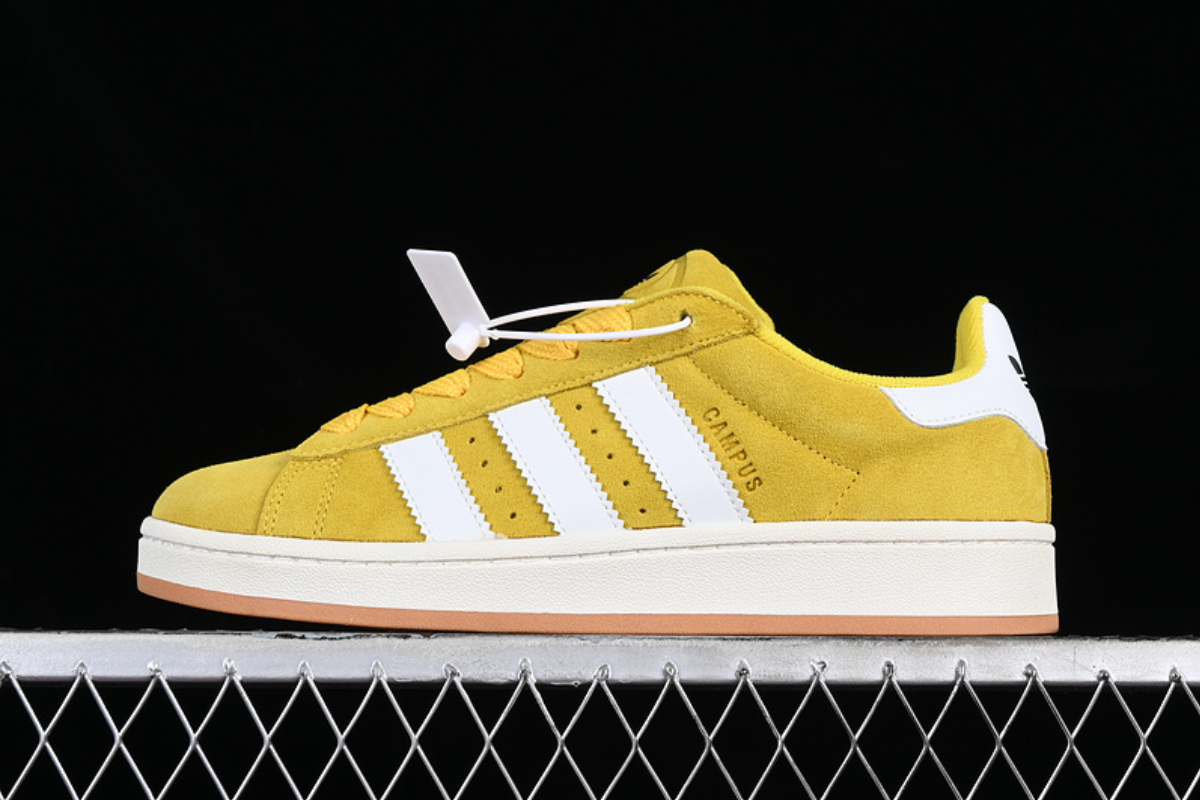 The Adidas Campus 00s “Bold Gold” features a bright yellow suede upper with classic white stripes and a retro silhouette, blending vintage style with everyday comfort.