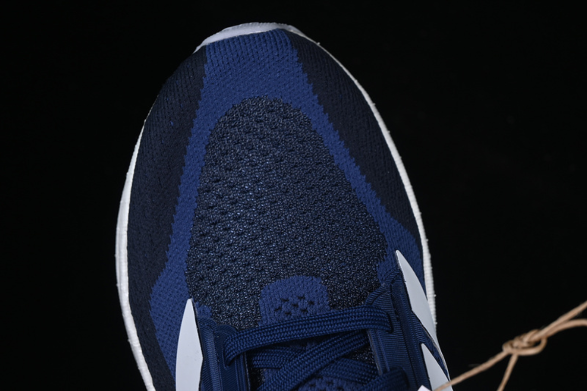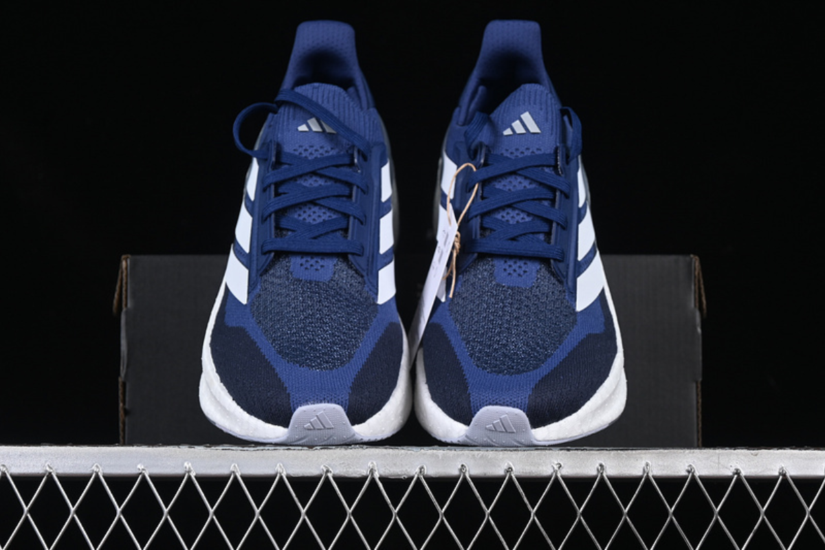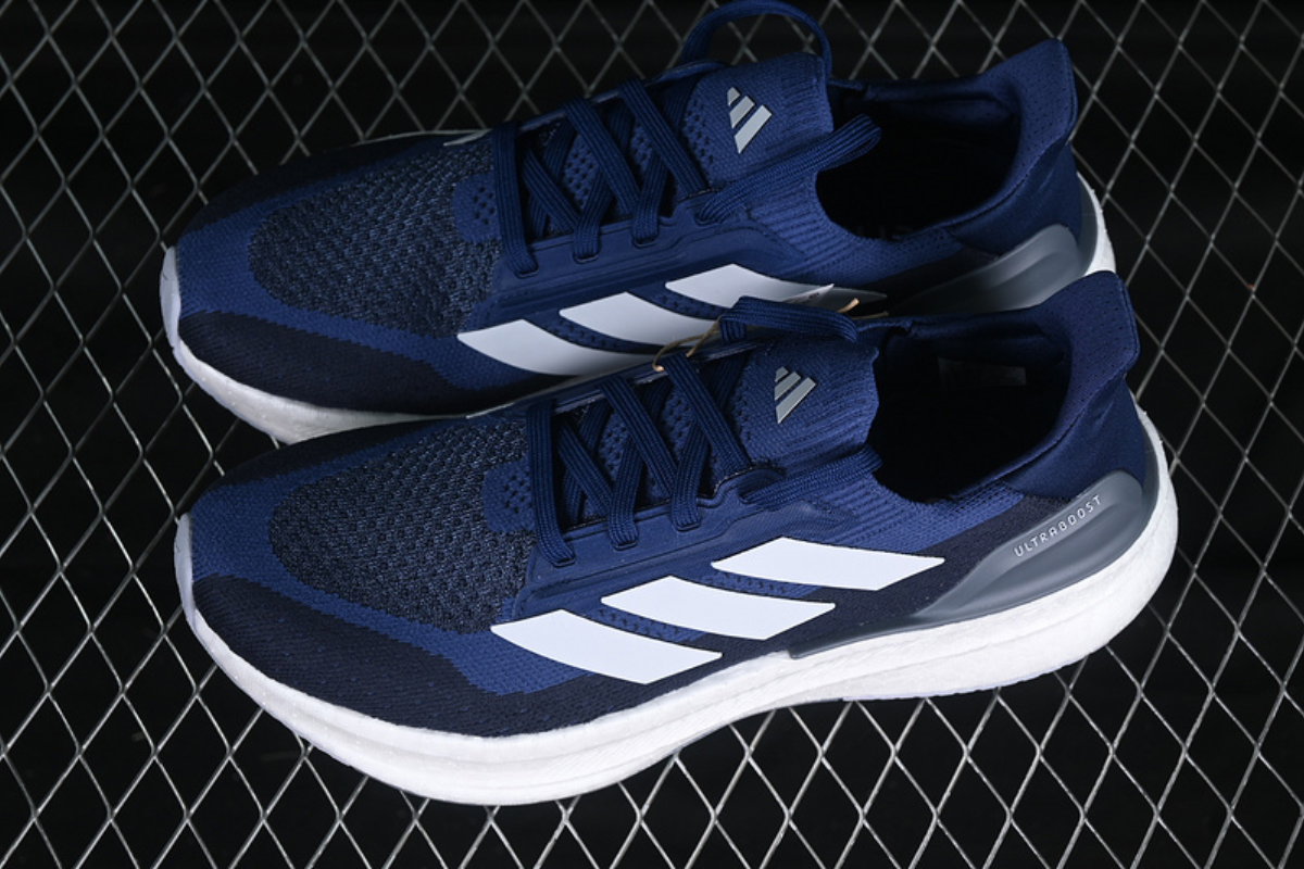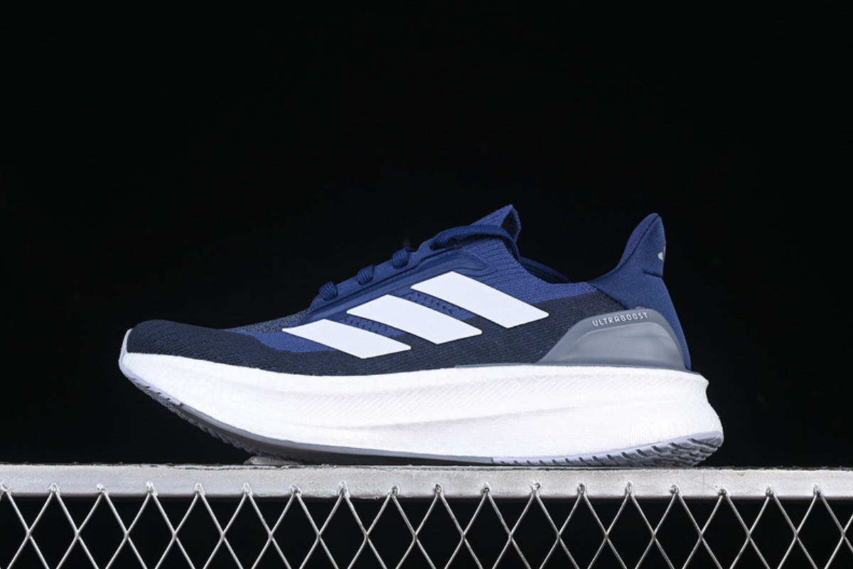 This is a stylish Adidas running shoe featuring a navy blue mesh upper, the iconic white three-stripe branding, and a thick cushioned sole for maximum comfort and support. Designed for both performance and everyday wear.