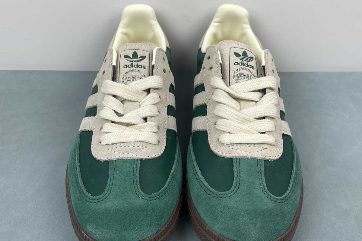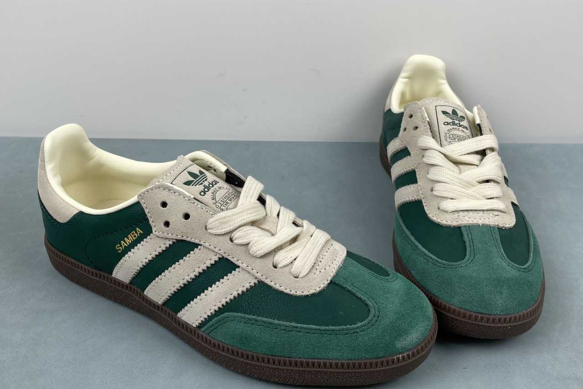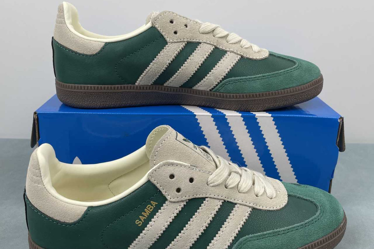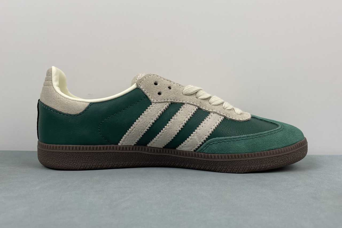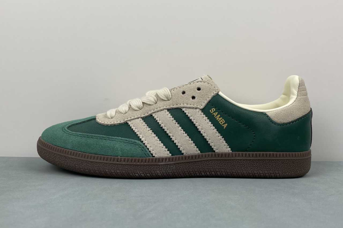 The Adidas Samba OG in Night Cargo Green brings a fresh twist to a timeless classic. Featuring a rich green leather and suede upper with off-white accents and a dark gum sole, it's a stylish blend of heritage and modern streetwear.