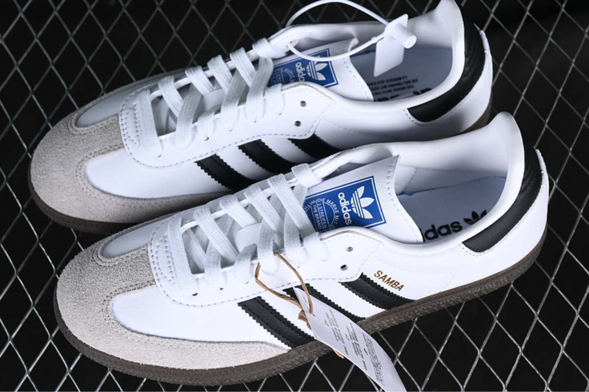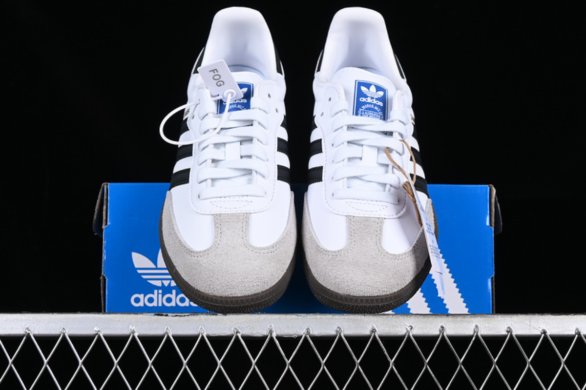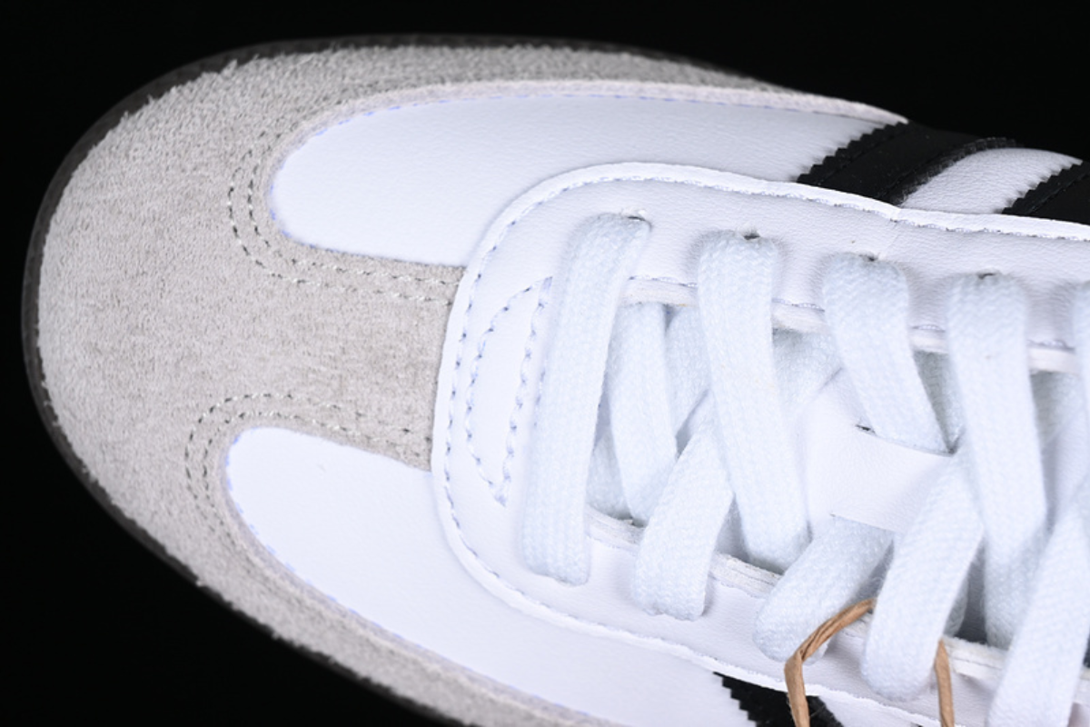 The Samba OG White/Black/Grey is a classic Adidas sneaker featuring a smooth white leather upper, iconic black Three Stripes, and a grey suede toe cap. Designed with a gum rubber sole for traction and style, it's a timeless silhouette perfect for casual wear.