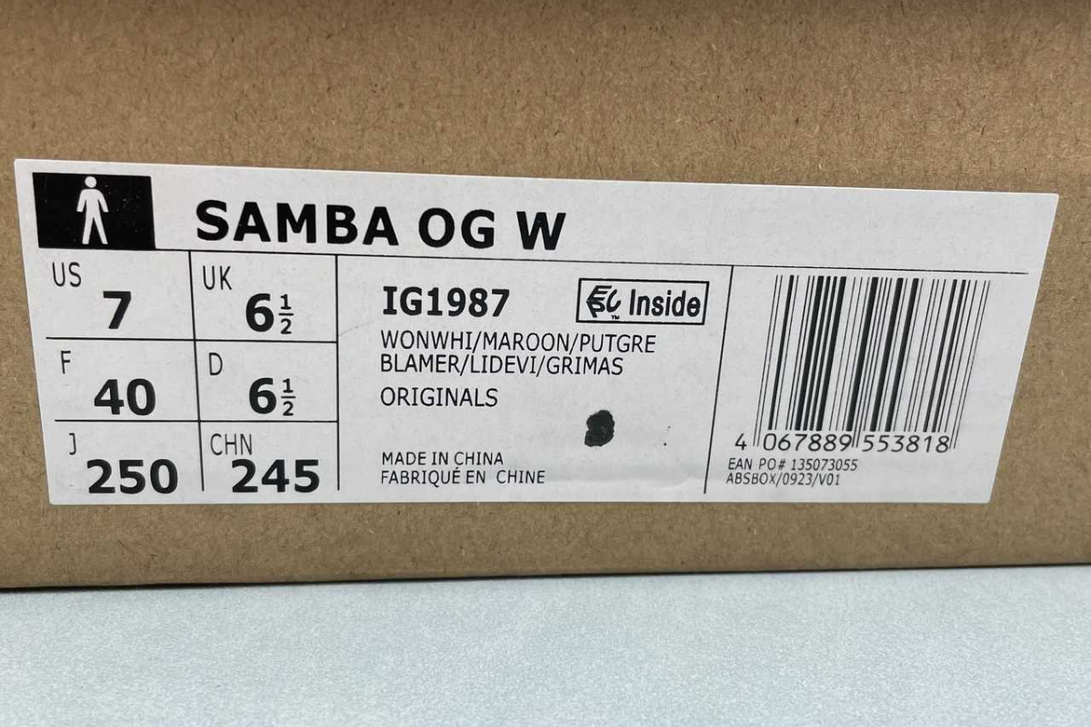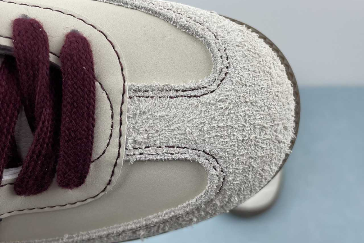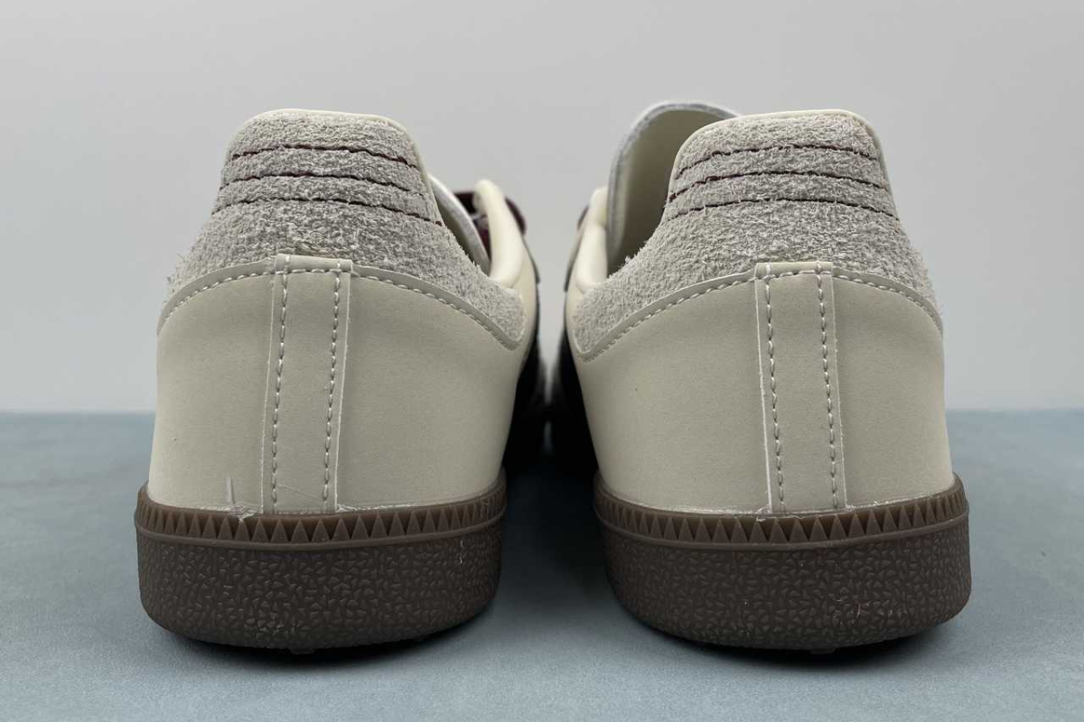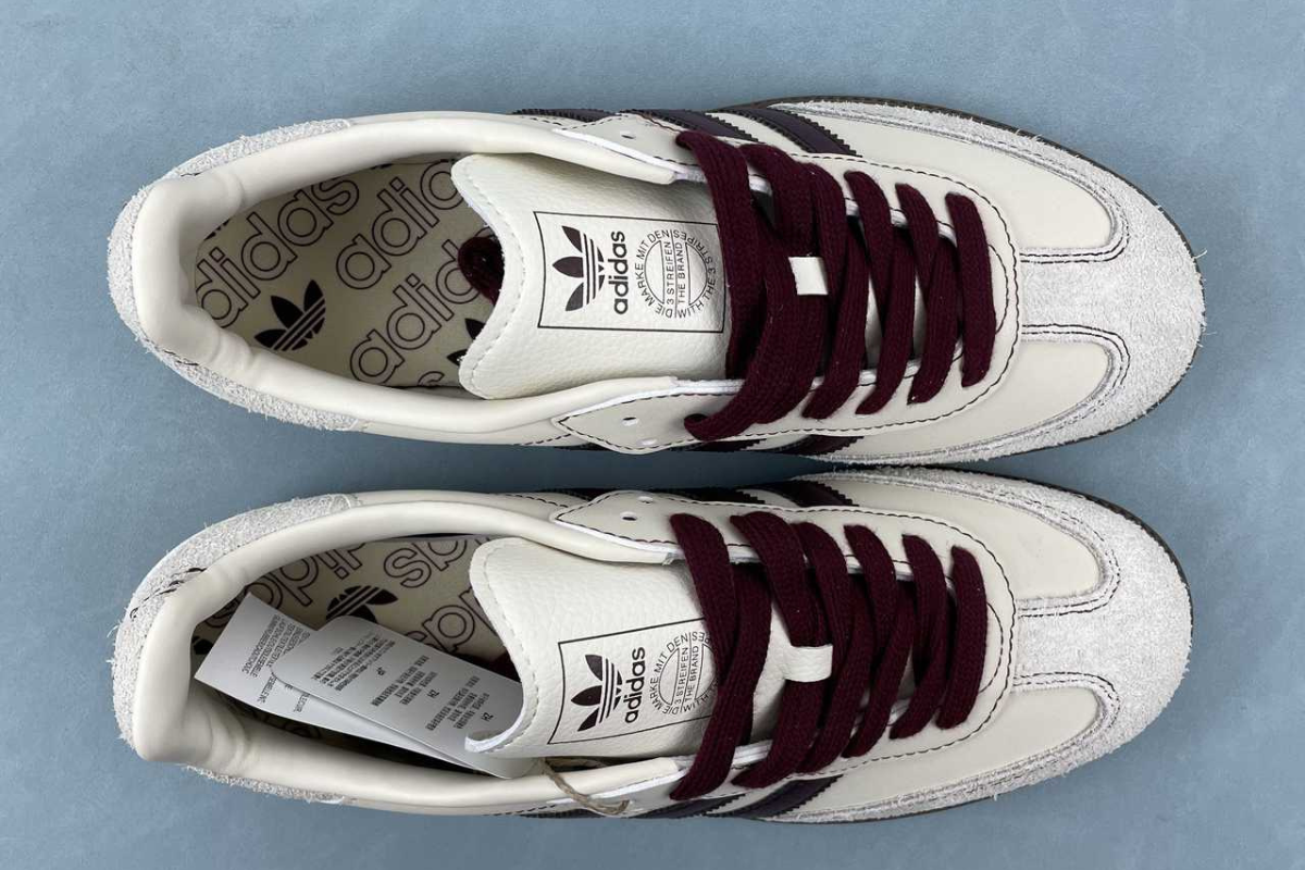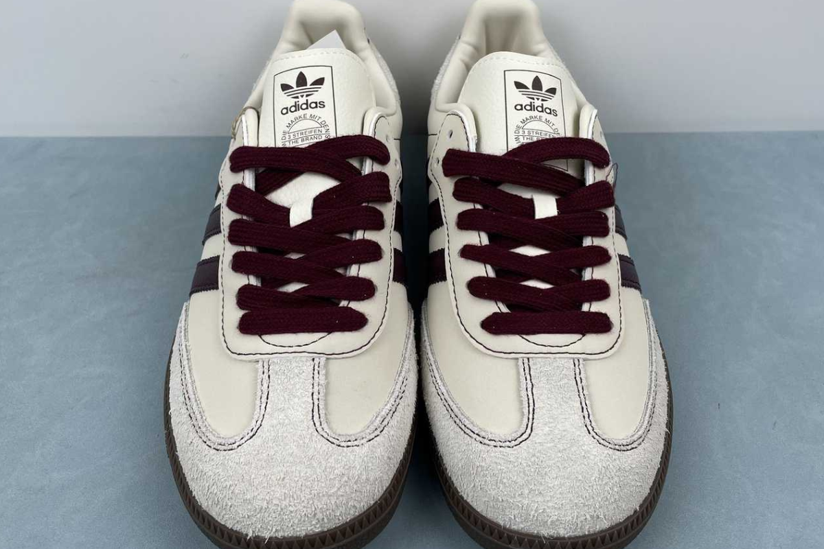 The Adidas Samba OG White Maroon Gum features a smooth off-white leather upper, rich maroon three-stripe branding and laces, grey suede overlays, and a classic gum rubber sole. A clean and timeless sneaker with a bold twist.