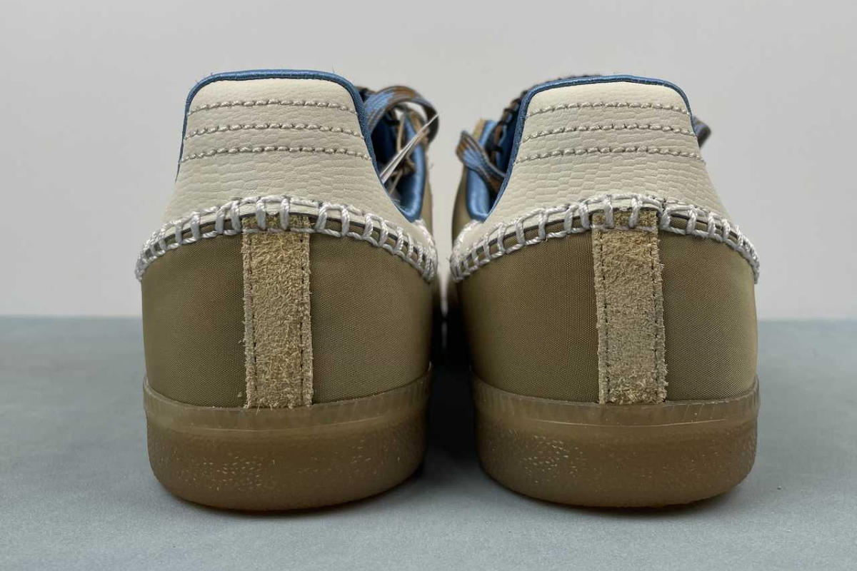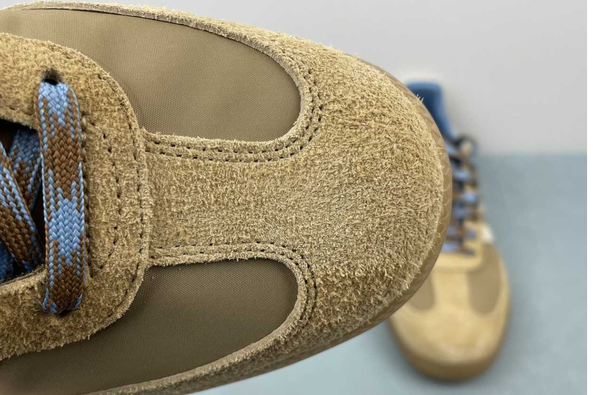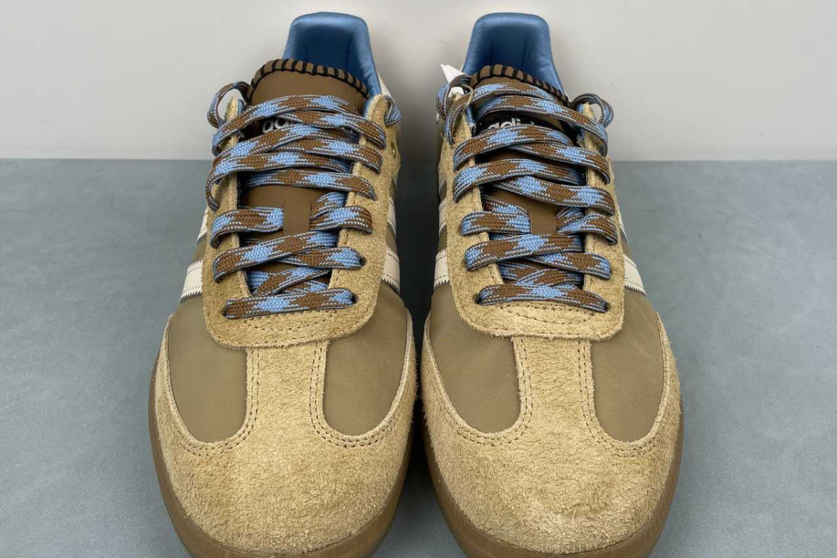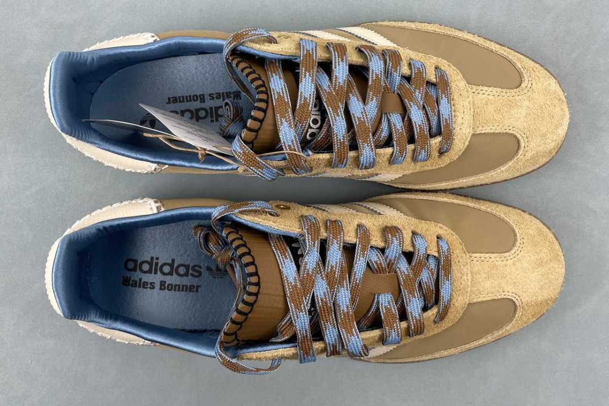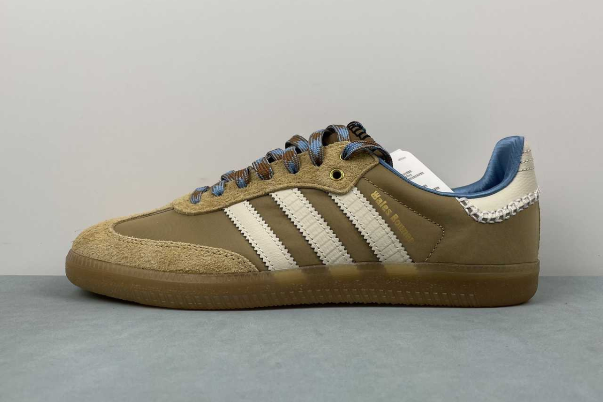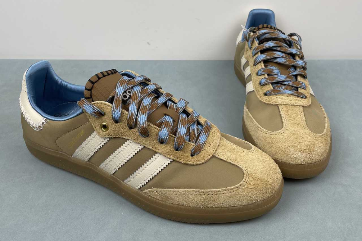 This premium collaboration between Adidas and Wales Bonner reimagines the classic Samba silhouette in a rich brown nylon upper with suede overlays, signature zigzag stitching, and blue satin lining. Designed with cultural depth and luxury streetwear flair.