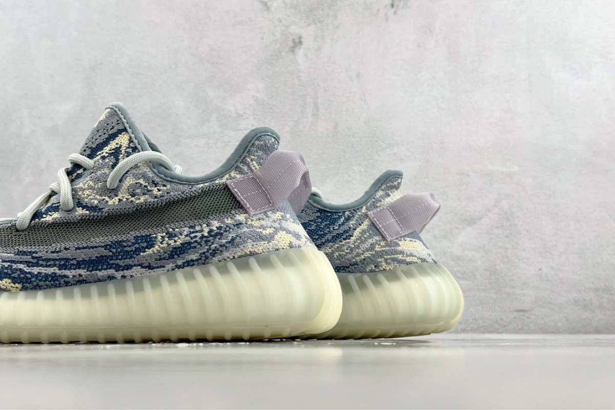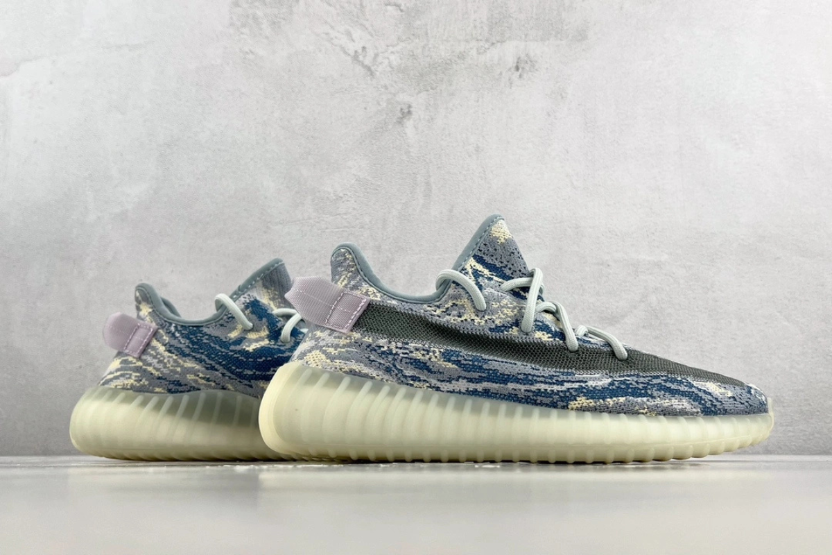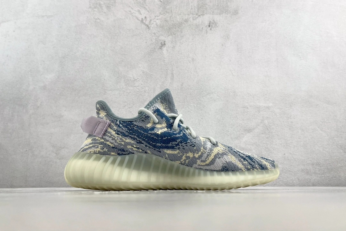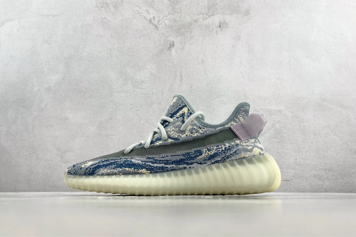 The Adidas Yeezy Boost 350 V2 ‘MX Blue’ features a swirling mix of blue, grey, and cream tones on its Primeknit upper, offering a unique marbled look. It sits atop a translucent ribbed midsole with Boost cushioning for comfort and performance. A pull tab on the heel adds a functional touch to its bold, futuristic design.