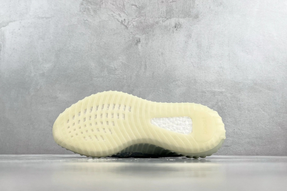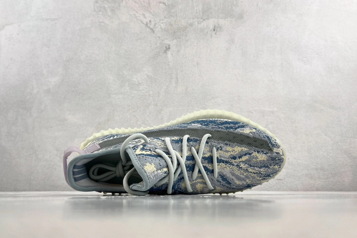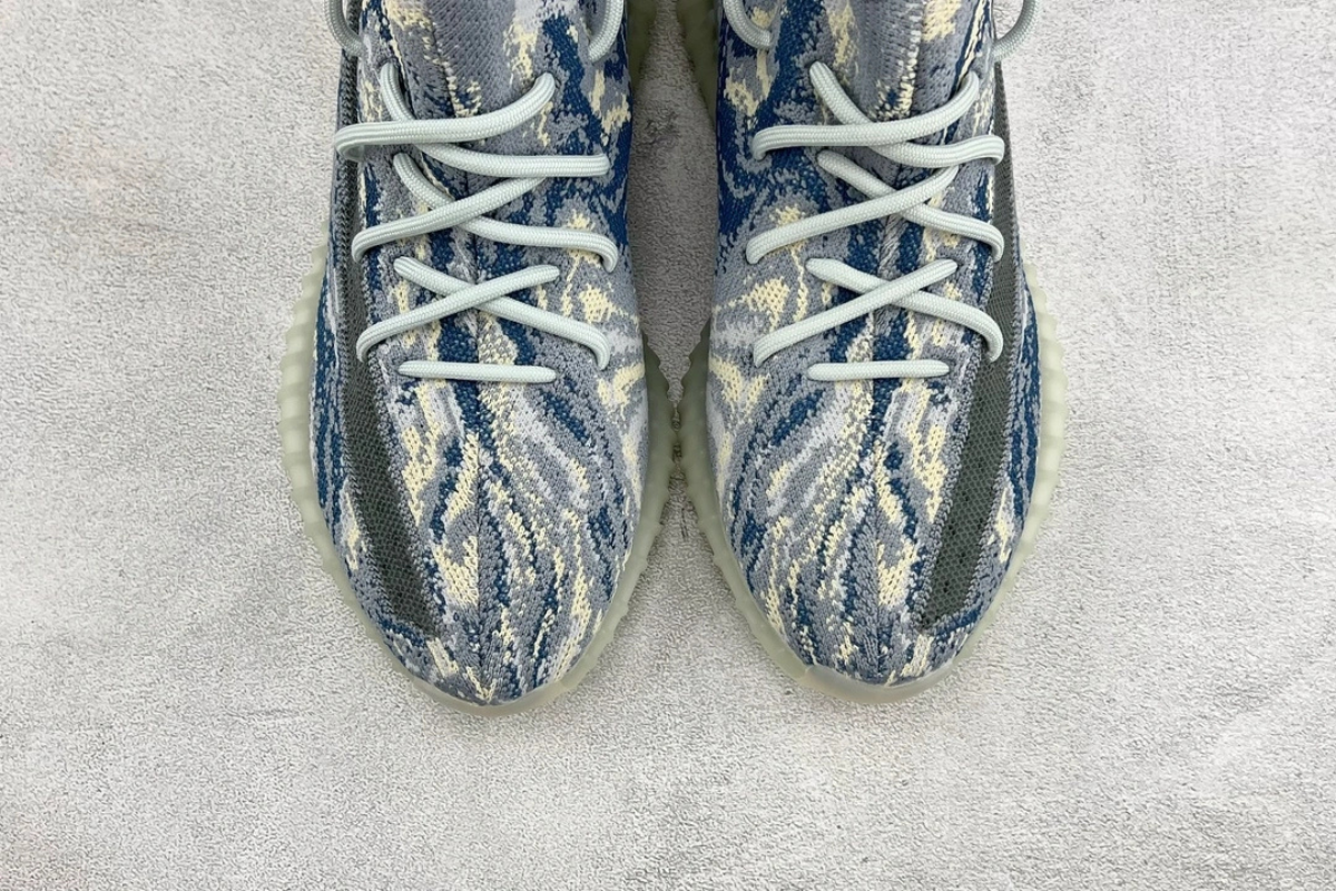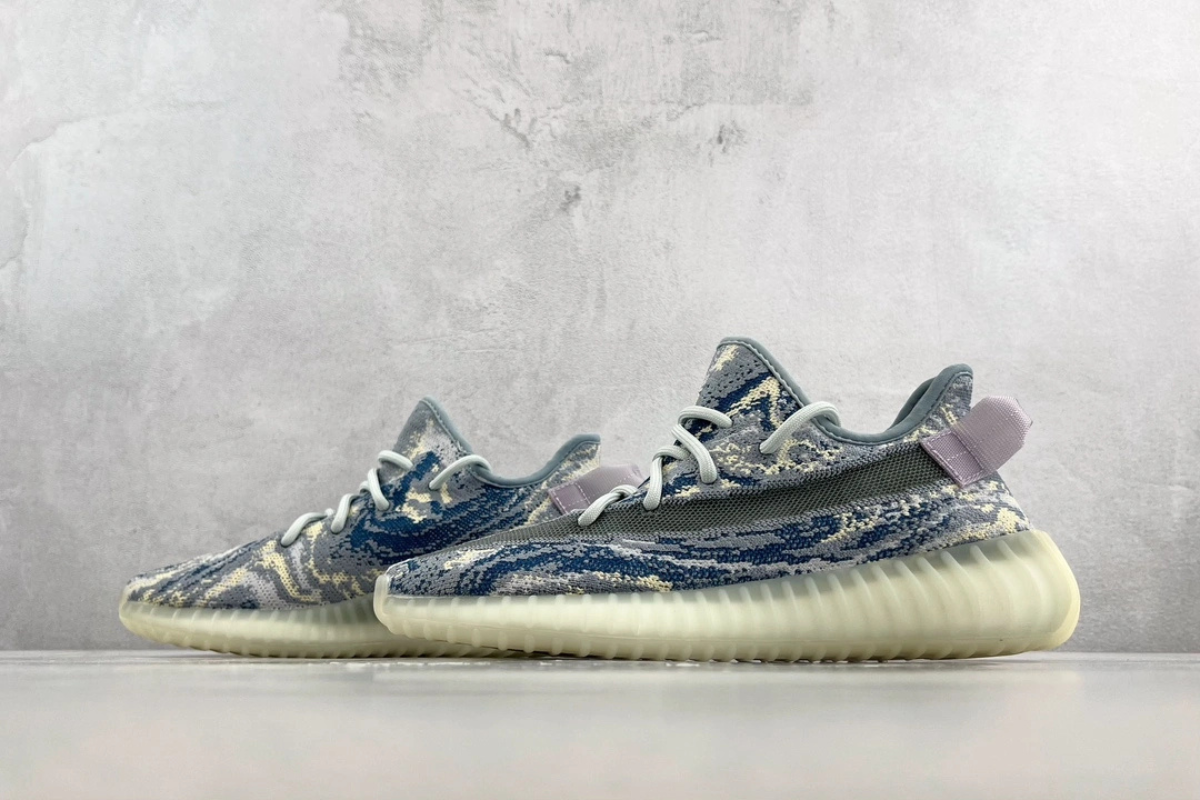 The Adidas Yeezy Boost 350 V2 ‘MX Blue’ features a swirling mix of blue, grey, and cream tones on its Primeknit upper, offering a unique marbled look. It sits atop a translucent ribbed midsole with Boost cushioning for comfort and performance. A pull tab on the heel adds a functional touch to its bold, futuristic design.