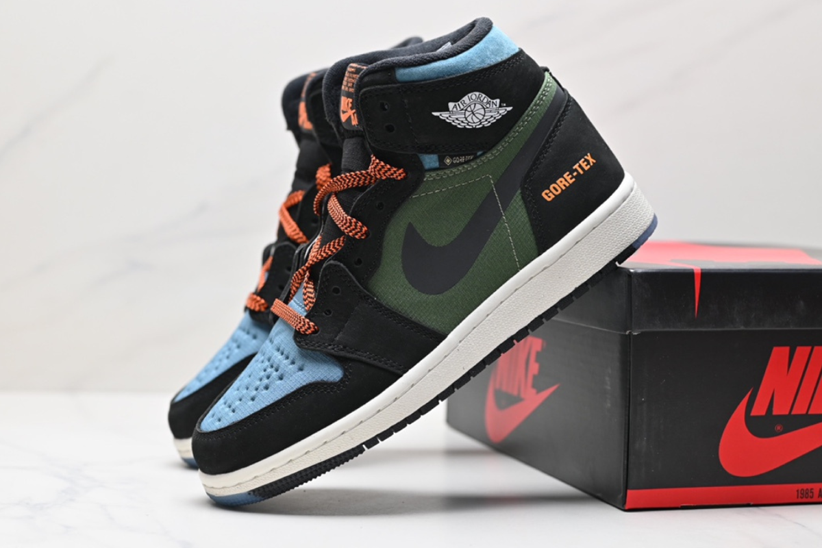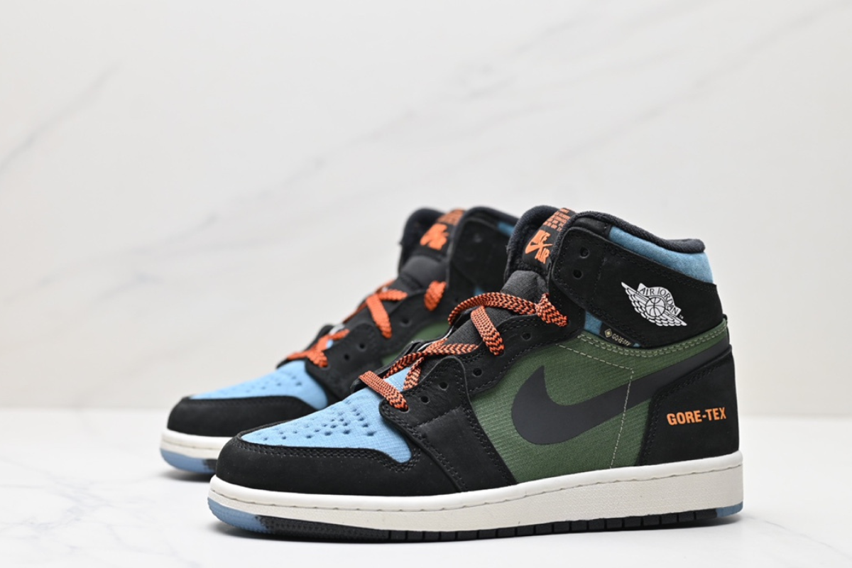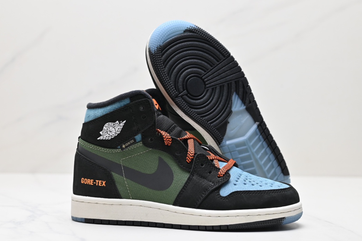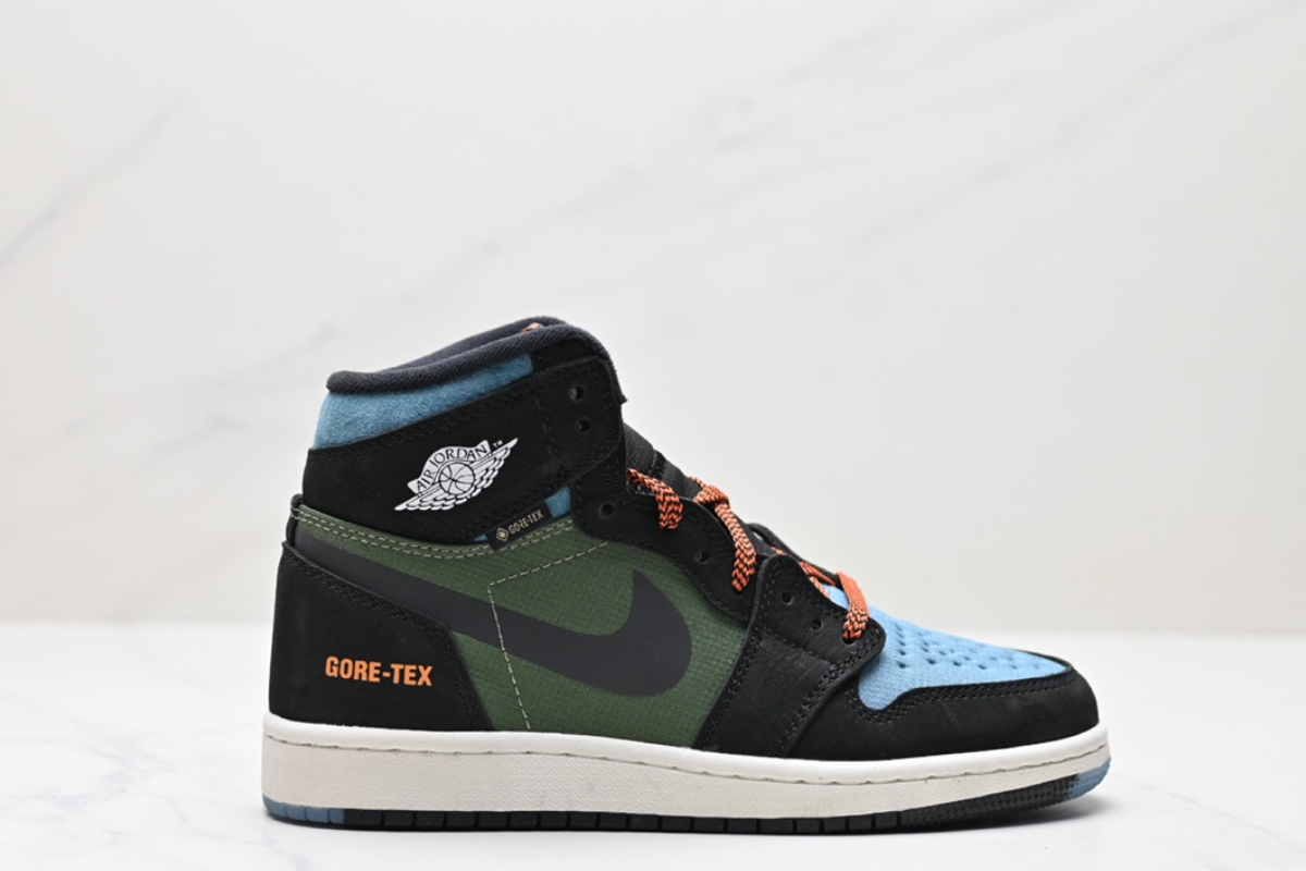 The Air Jordan 1 Element GORE-TEX combines iconic Jordan style with all-weather protection. Featuring a waterproof GORE-TEX upper in black, military green, and light blue, with orange accents and durable traction—perfect for any condition.