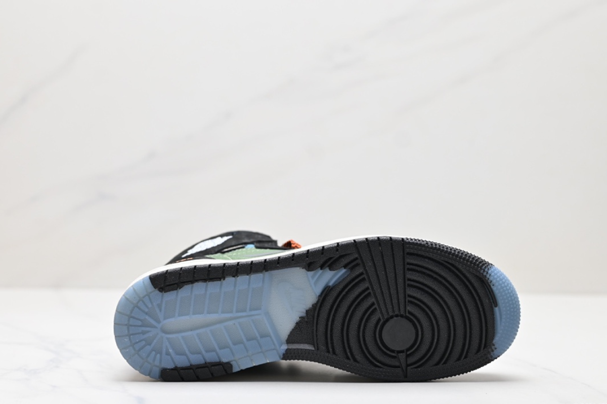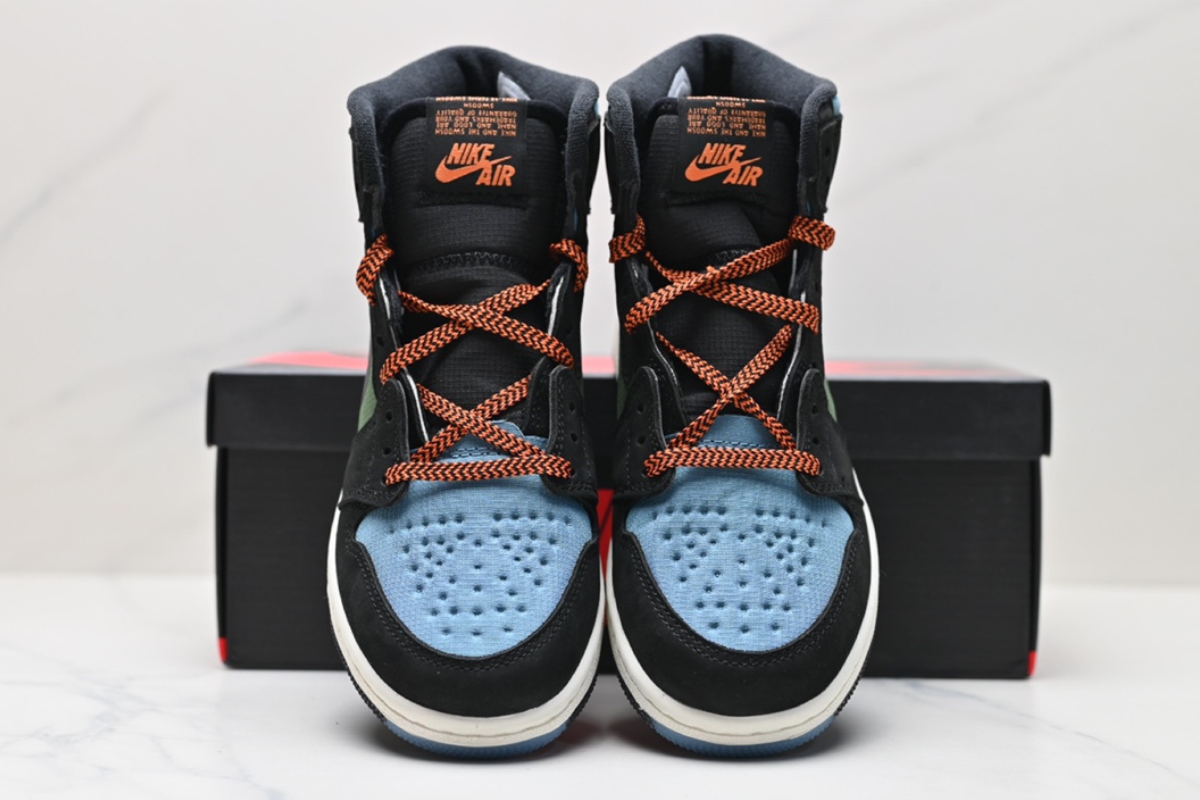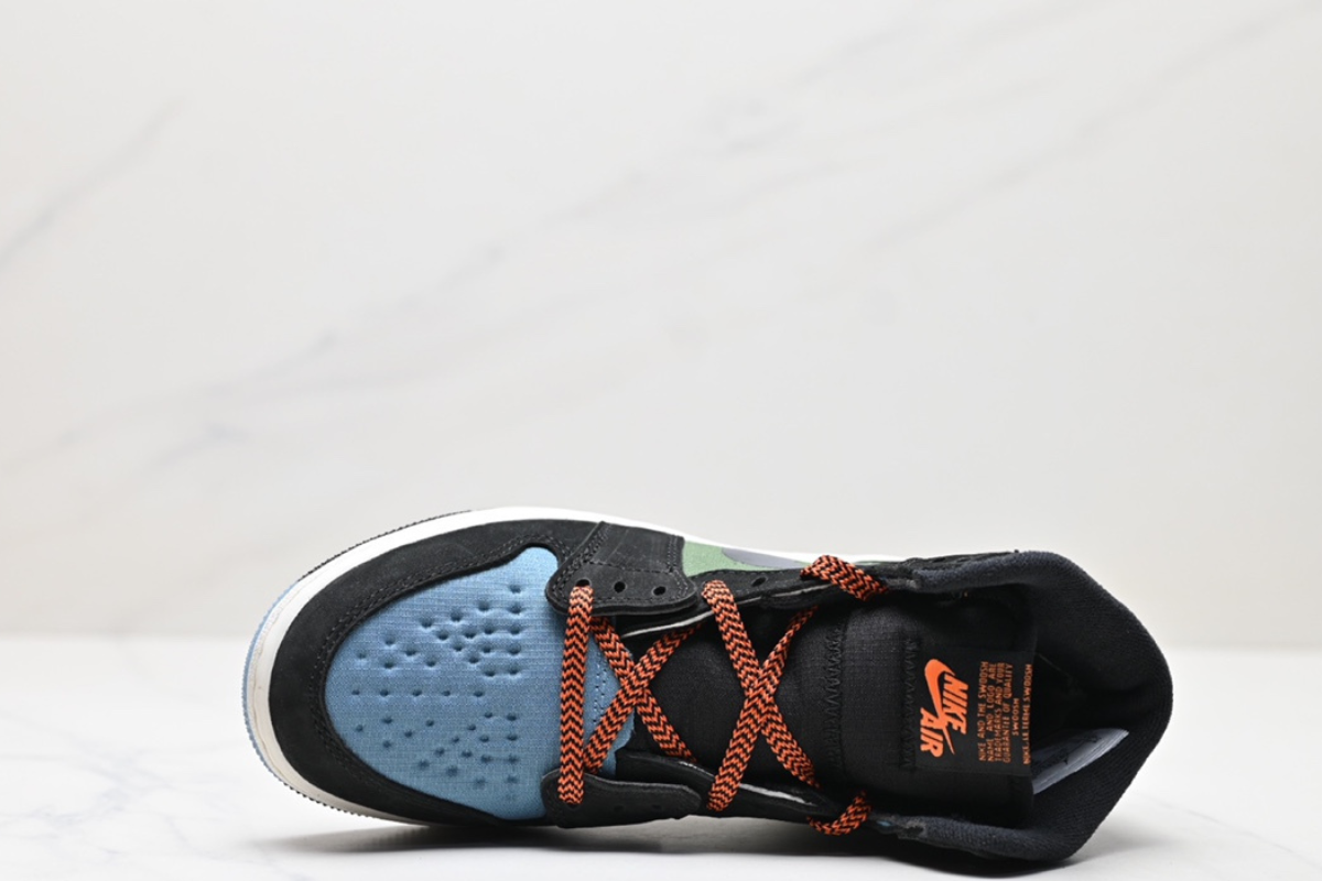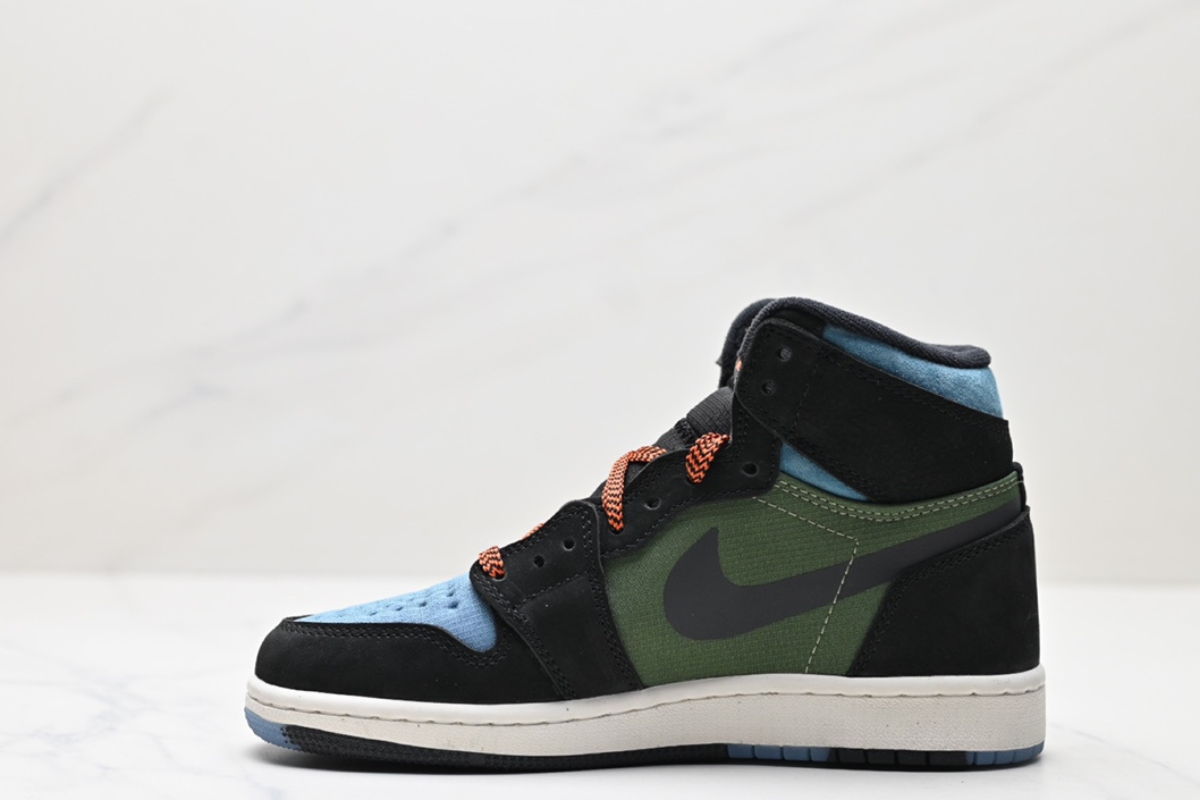 The Air Jordan 1 Element GORE-TEX combines iconic Jordan style with all-weather protection. Featuring a waterproof GORE-TEX upper in black, military green, and light blue, with orange accents and durable traction—perfect for any condition.