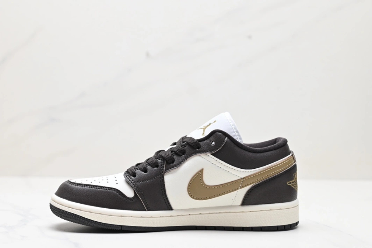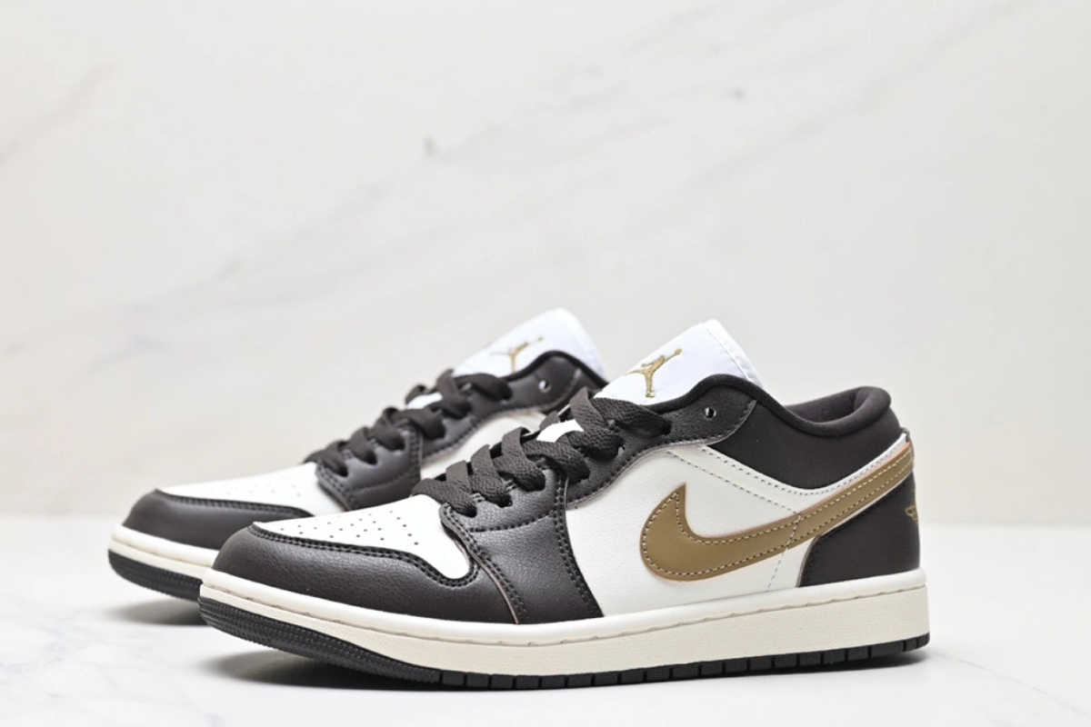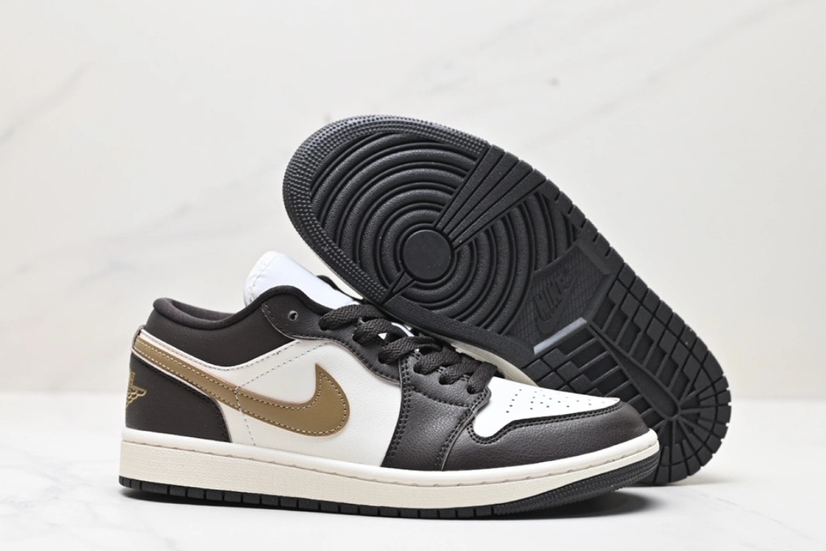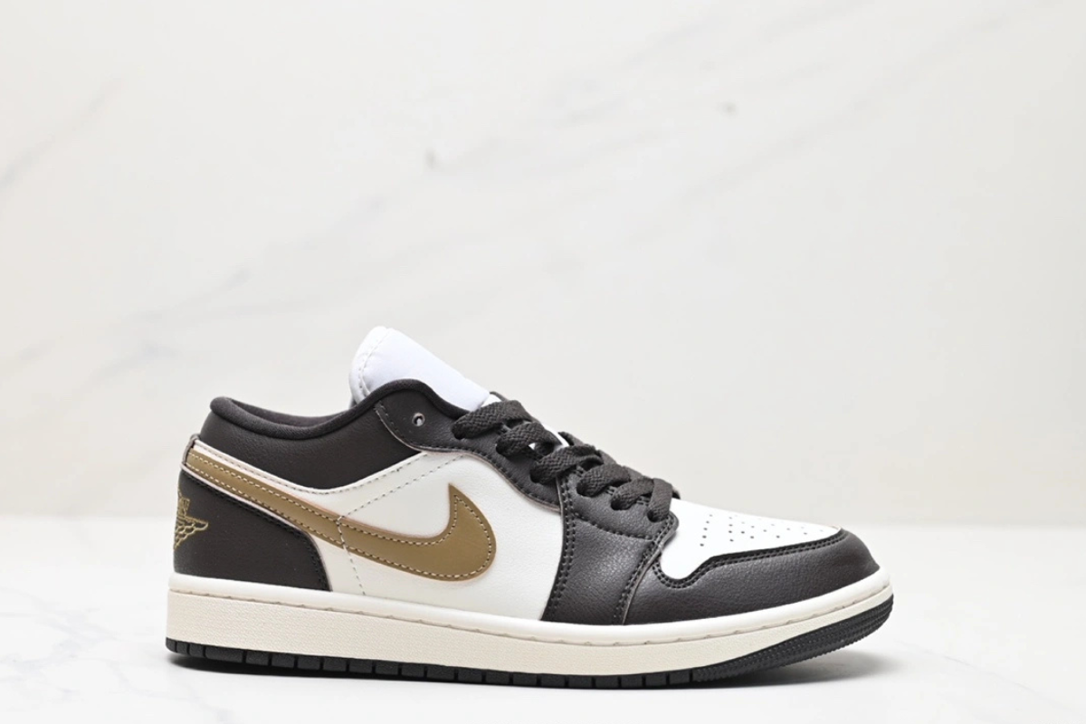 The Air Jordan 1 Low OG “Mocha Brown and Gold” features a sleek combination of dark brown and white leather with a metallic gold Swoosh. Designed for both comfort and style, this low-top sneaker offers a classic silhouette with modern flair, perfect for everyday wear or street-ready looks.