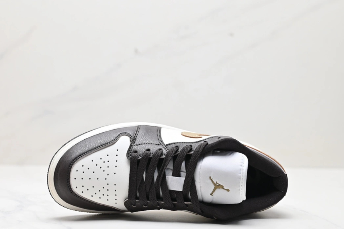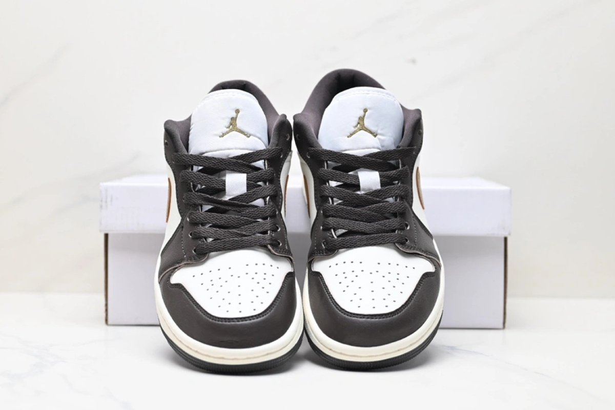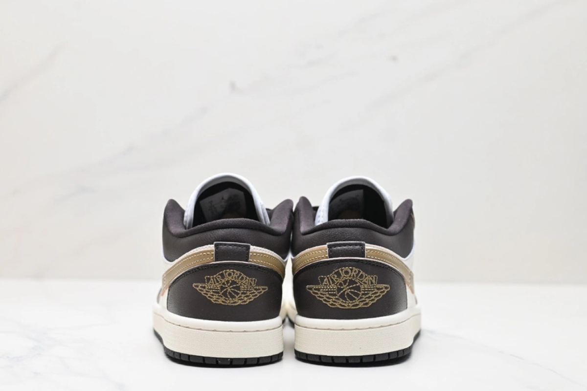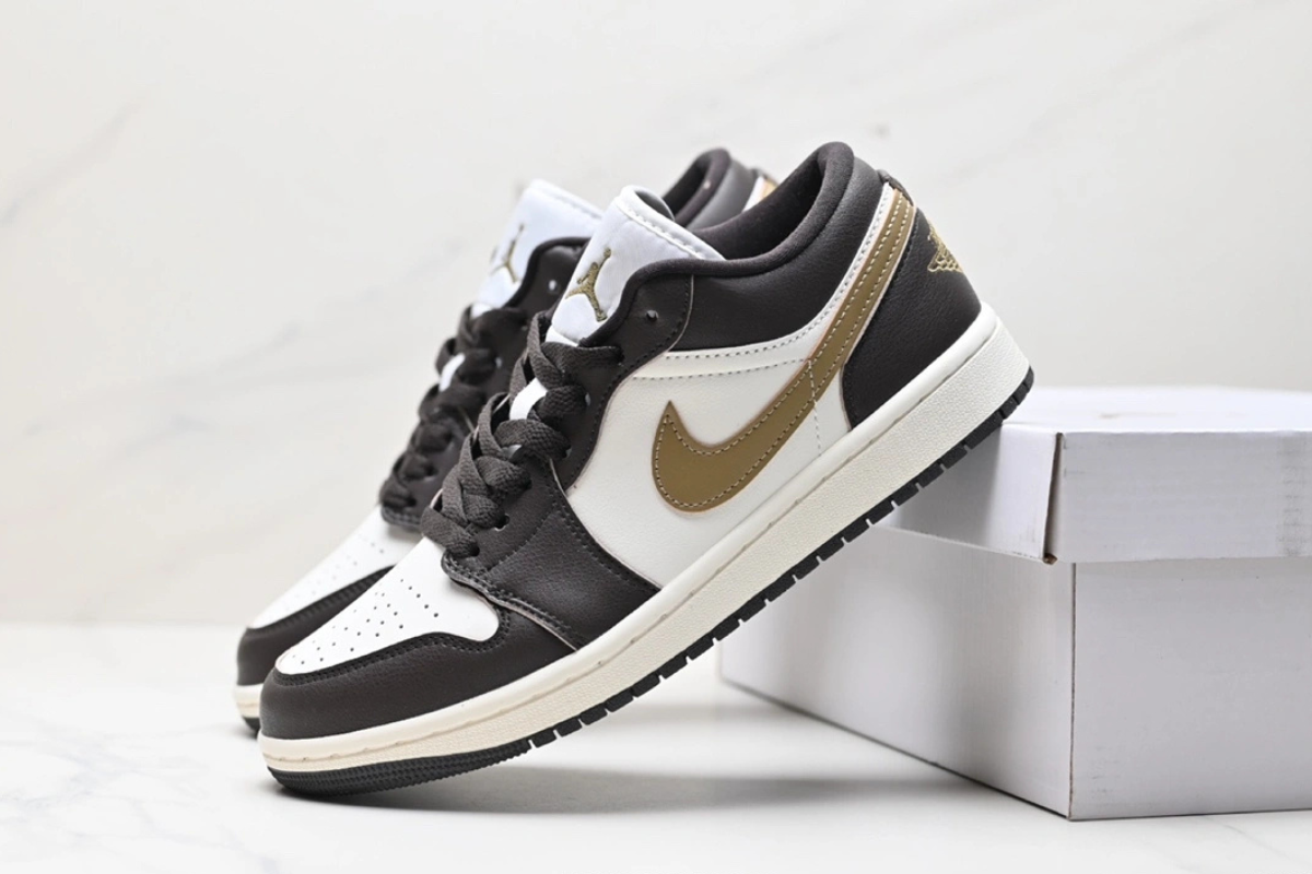 The Air Jordan 1 Low OG “Mocha Brown and Gold” features a sleek combination of dark brown and white leather with a metallic gold Swoosh. Designed for both comfort and style, this low-top sneaker offers a classic silhouette with modern flair, perfect for everyday wear or street-ready looks.