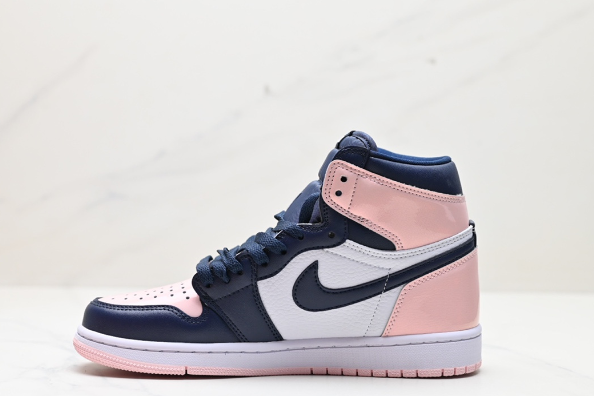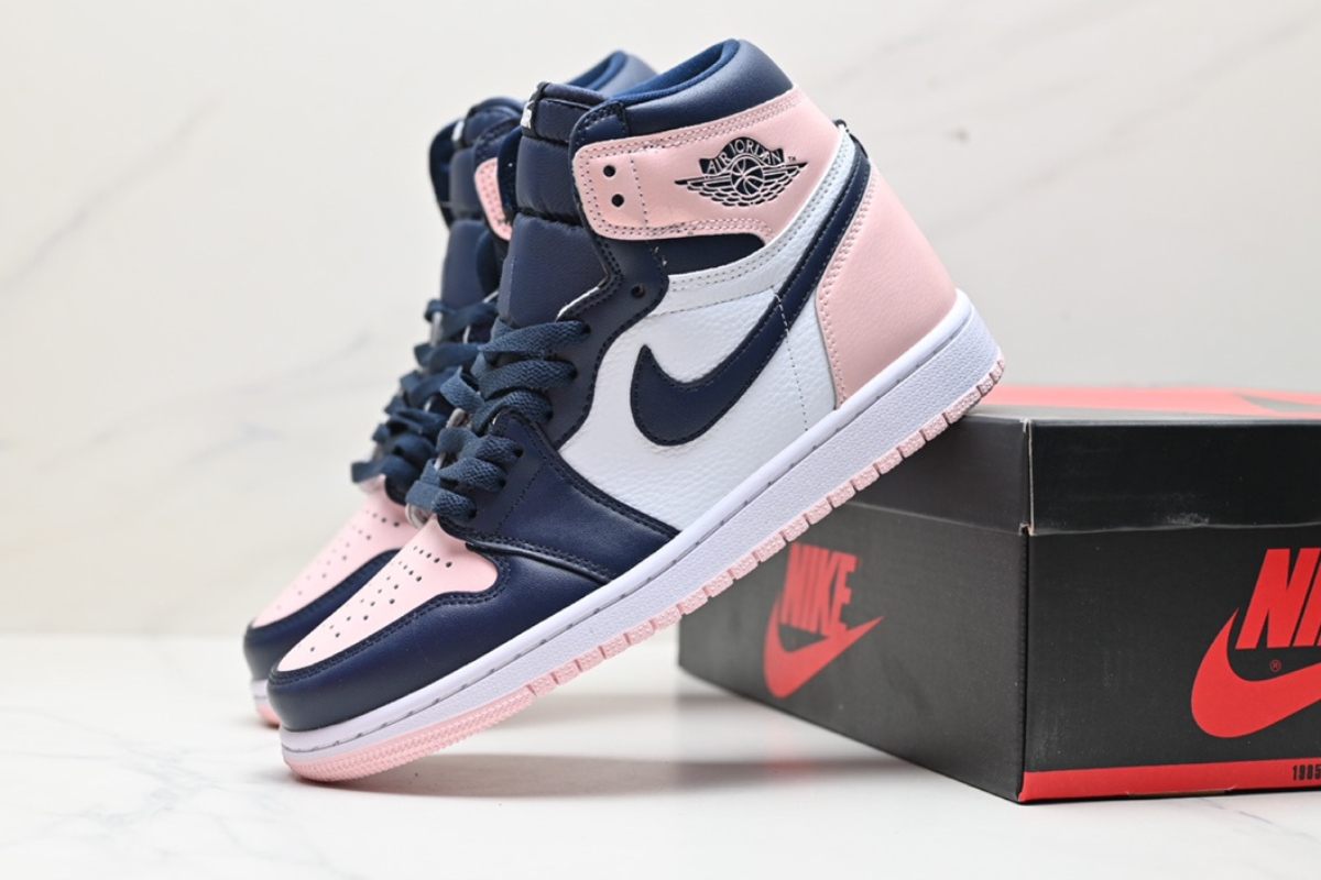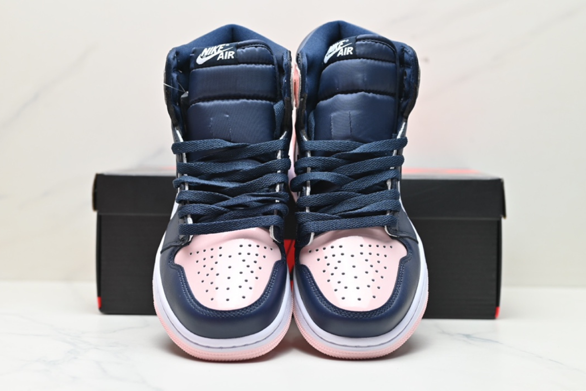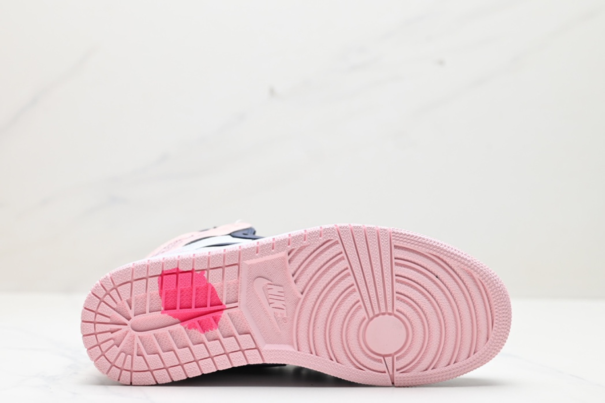 This women's-exclusive Air Jordan 1 features a stylish mix of soft pink, navy, and white leather panels. It combines classic Air Jordan design with a fresh, pastel-inspired colorway for a clean yet bold look. Perfect for casual wear or collectors.