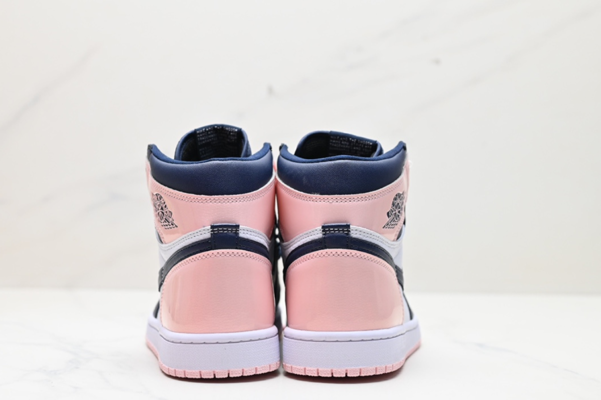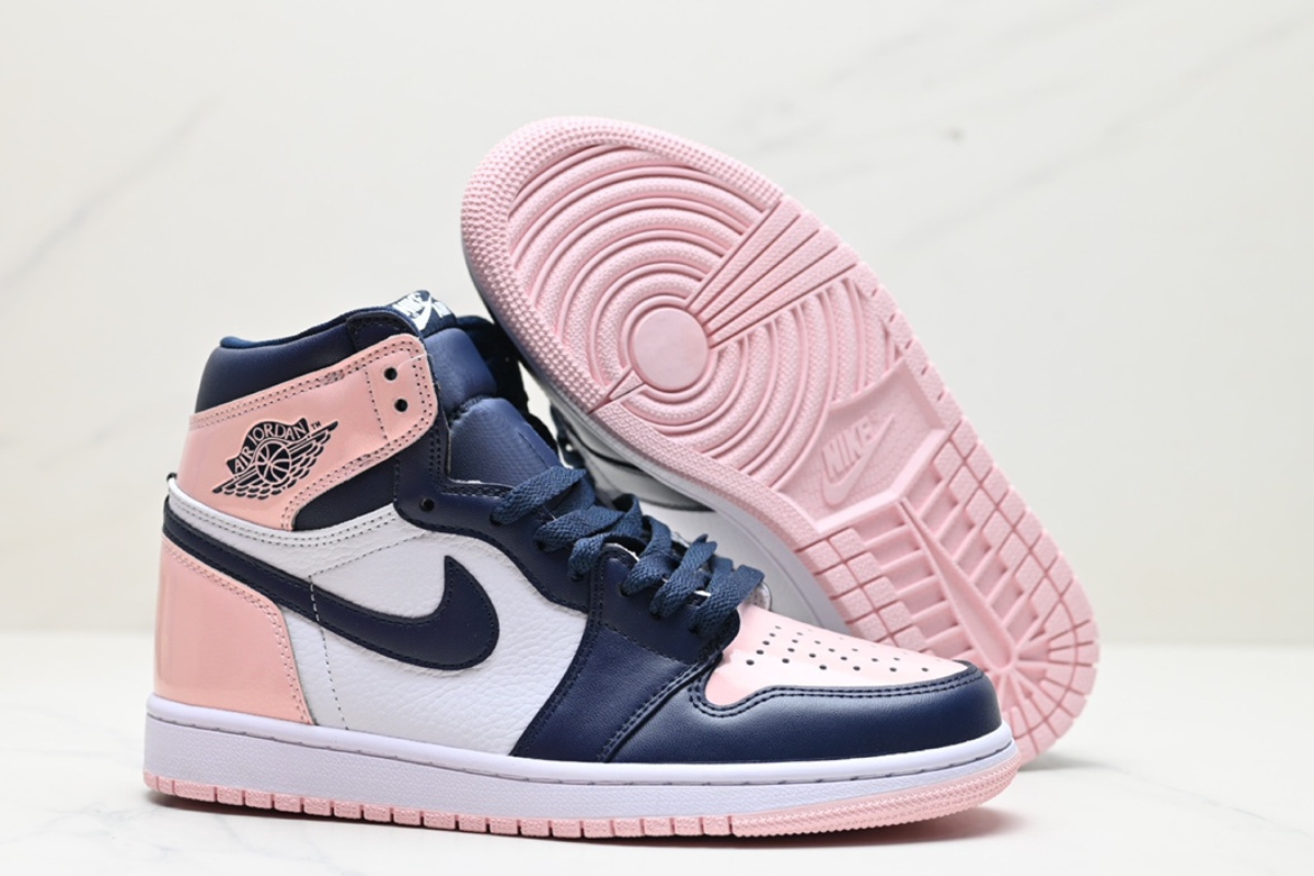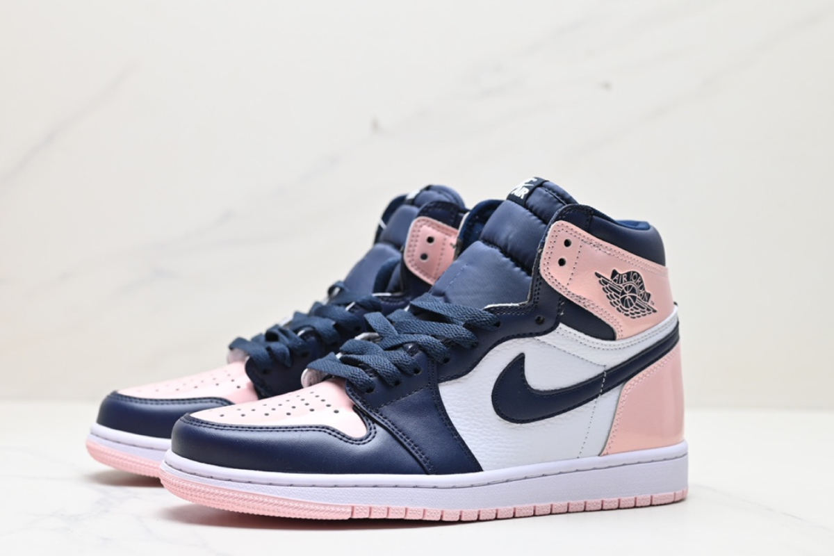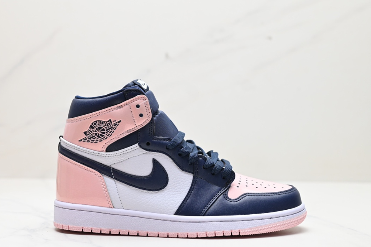This women's-exclusive Air Jordan 1 features a stylish mix of soft pink, navy, and white leather panels. It combines classic Air Jordan design with a fresh, pastel-inspired colorway for a clean yet bold look. Perfect for casual wear or collectors.