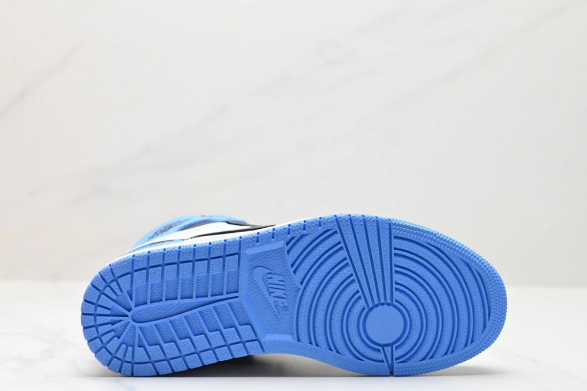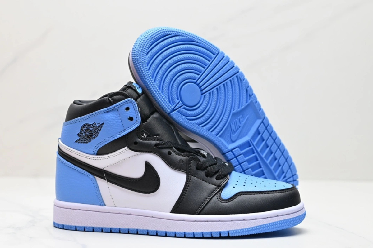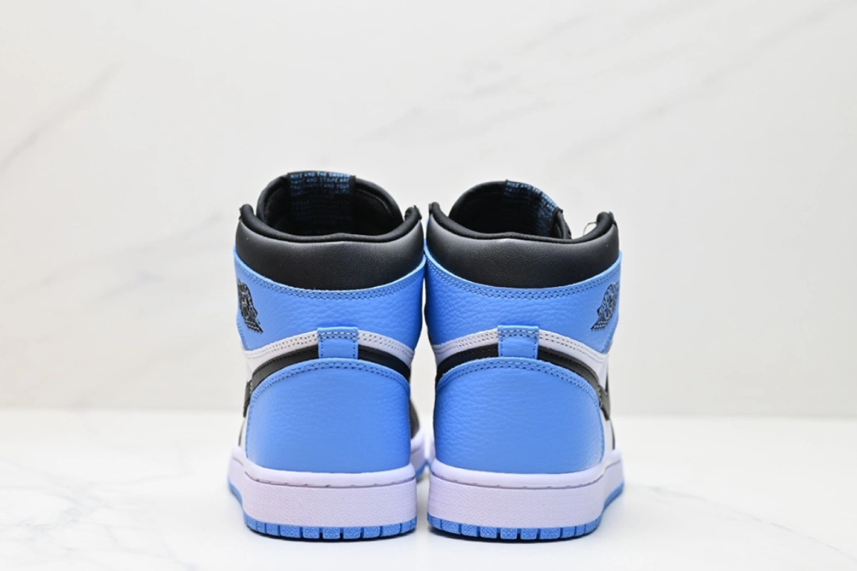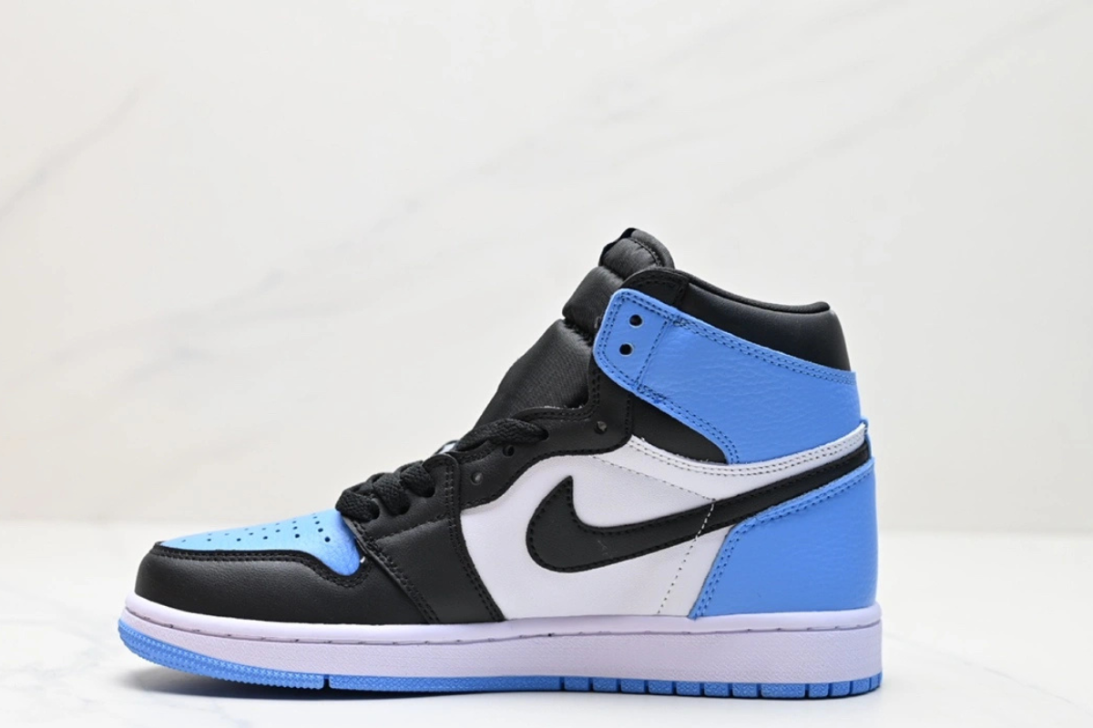 The Air Jordan 1 Retro High University Blue features a premium leather upper with a classic colorway inspired by Michael Jordan's UNC roots. It combines white panels with bold University Blue overlays and black accents on the Swoosh and collar for a clean, iconic look. A timeless silhouette that blends heritage and street style.
