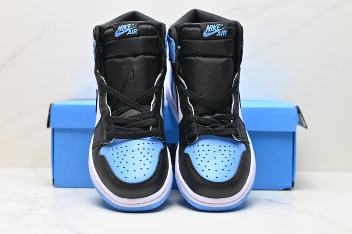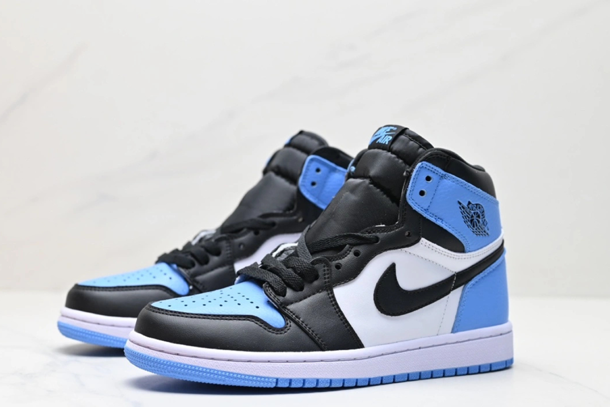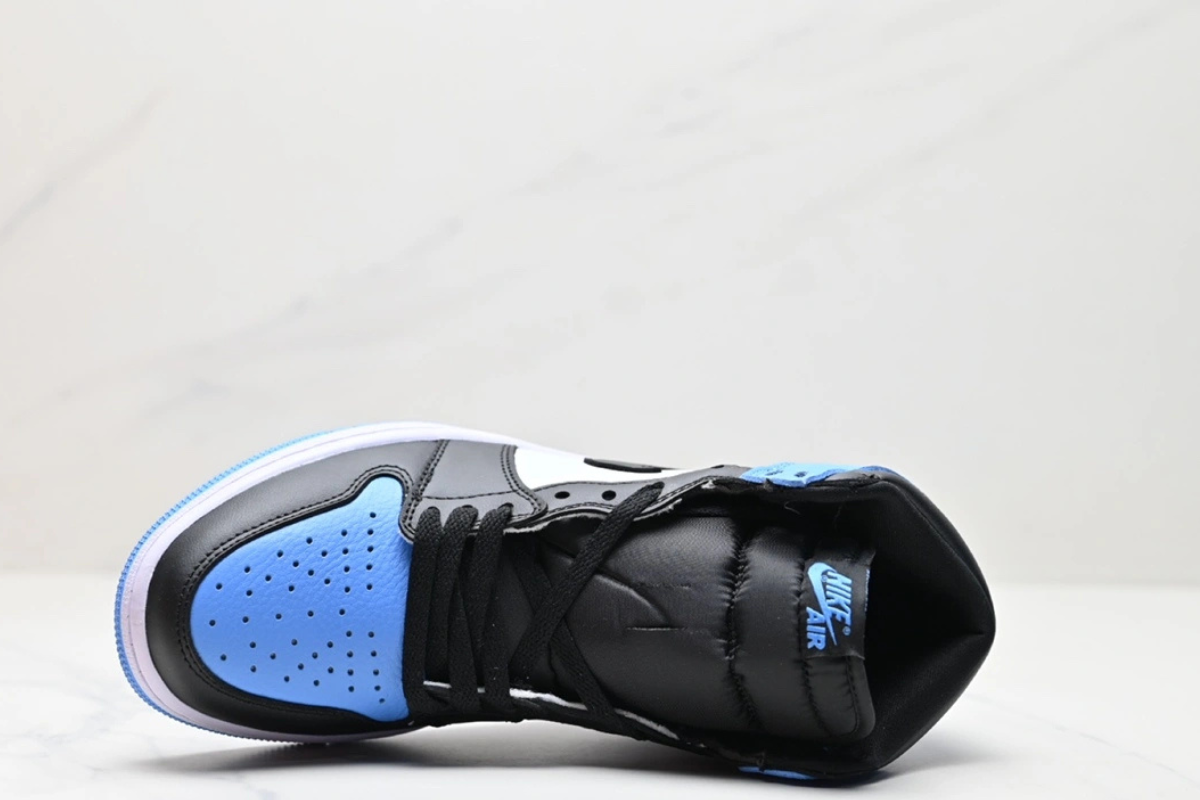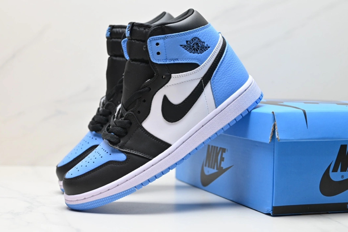 The Air Jordan 1 Retro High University Blue features a premium leather upper with a classic colorway inspired by Michael Jordan's UNC roots. It combines white panels with bold University Blue overlays and black accents on the Swoosh and collar for a clean, iconic look. A timeless silhouette that blends heritage and street style.