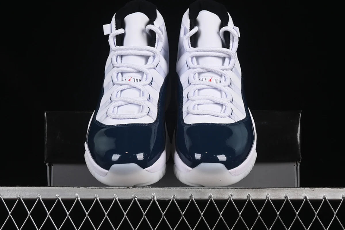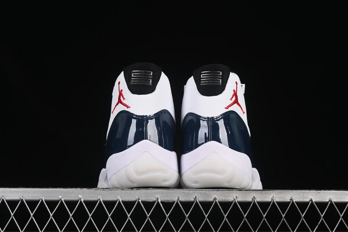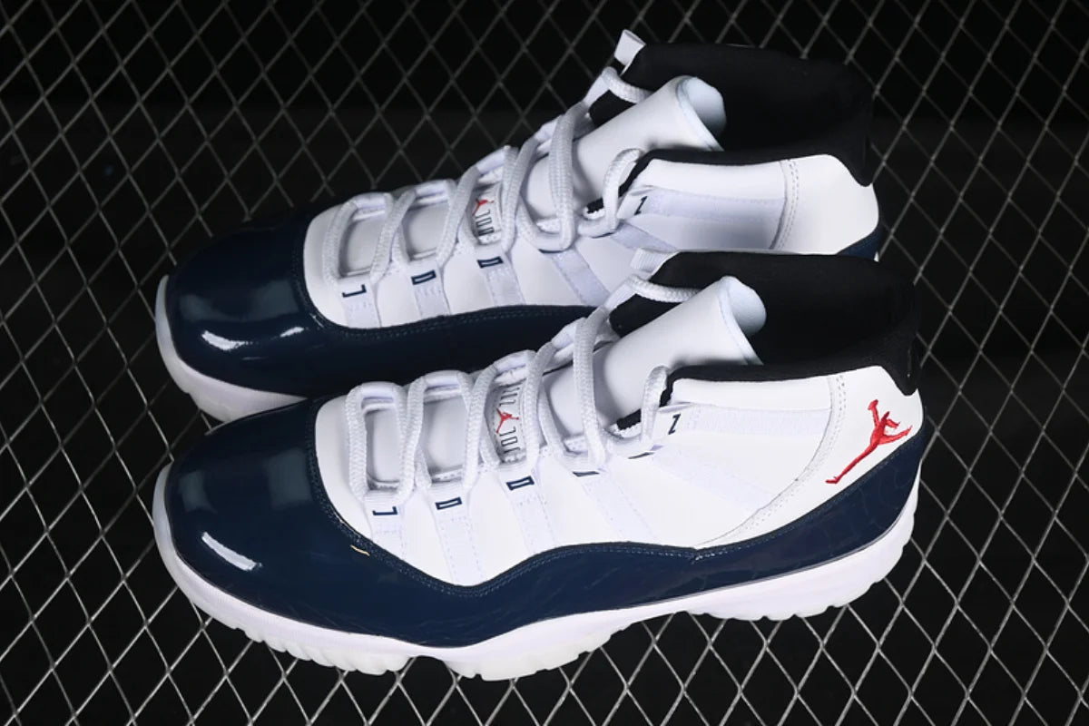 Step into classic Jordan heritage with the Air Jordan 11 Retro in White / Navy / Red. This iconic model features a sleek white upper combined with a bold navy patent leather mudguard, giving the shoe its signature glossy look. A bright red Jumpman logo on the heel adds the perfect pop of contrast.