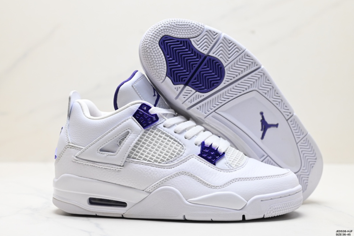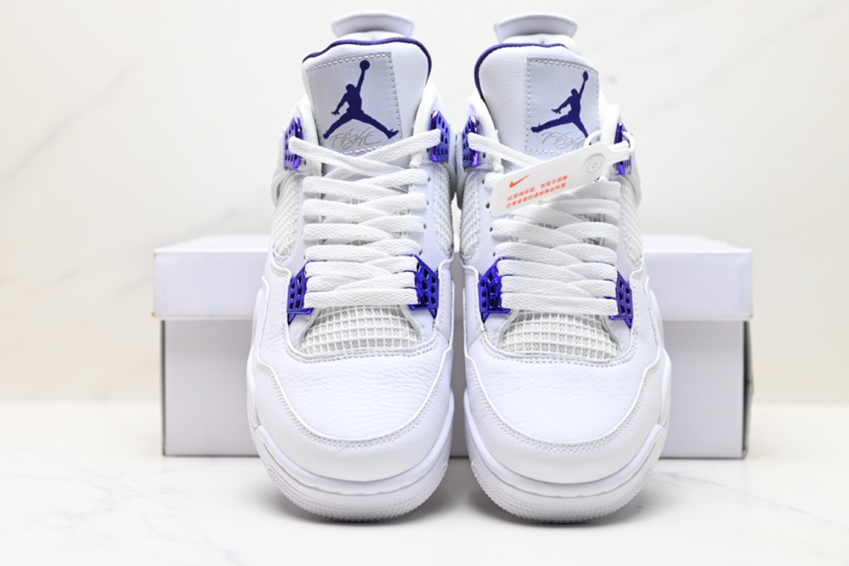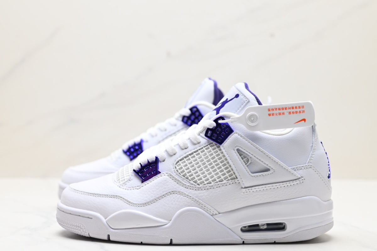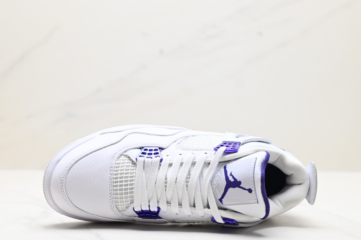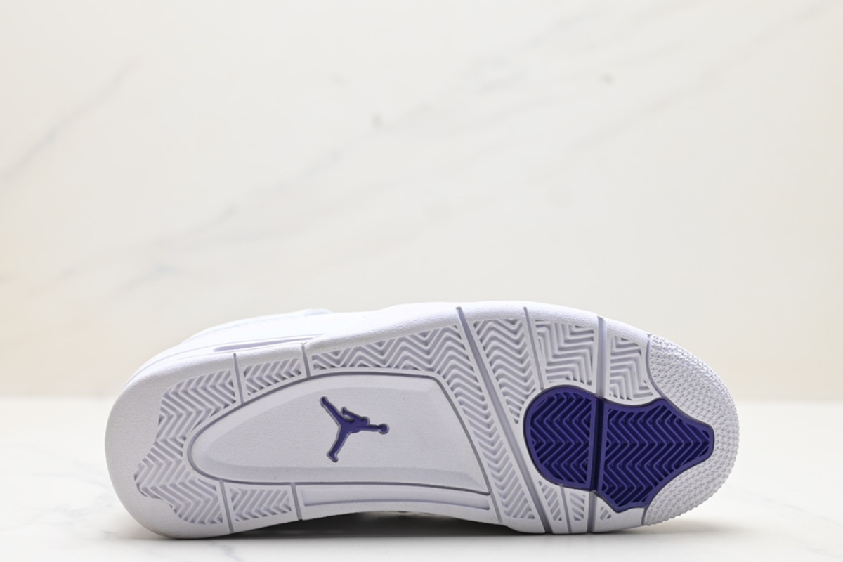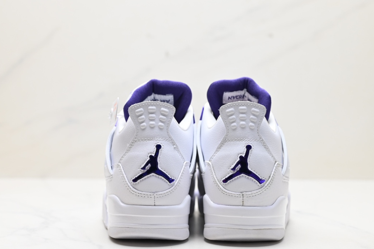 Clean and classic, the Air Jordan 4 Retro ‘Metallic Purple’ features a crisp white leather upper with vibrant purple accents, blending iconic design with a bold pop of color