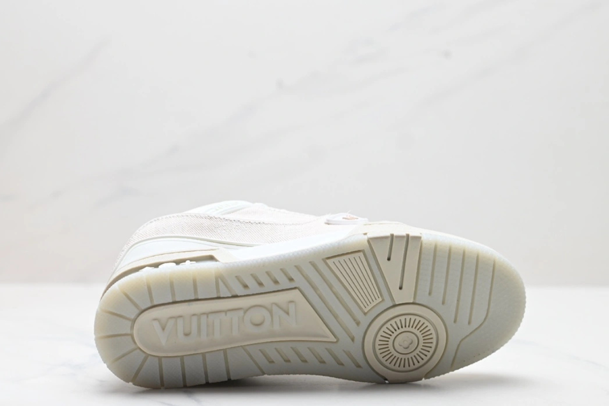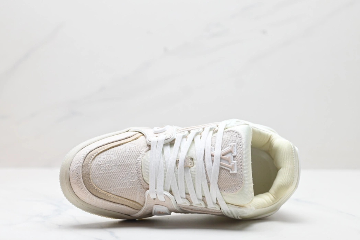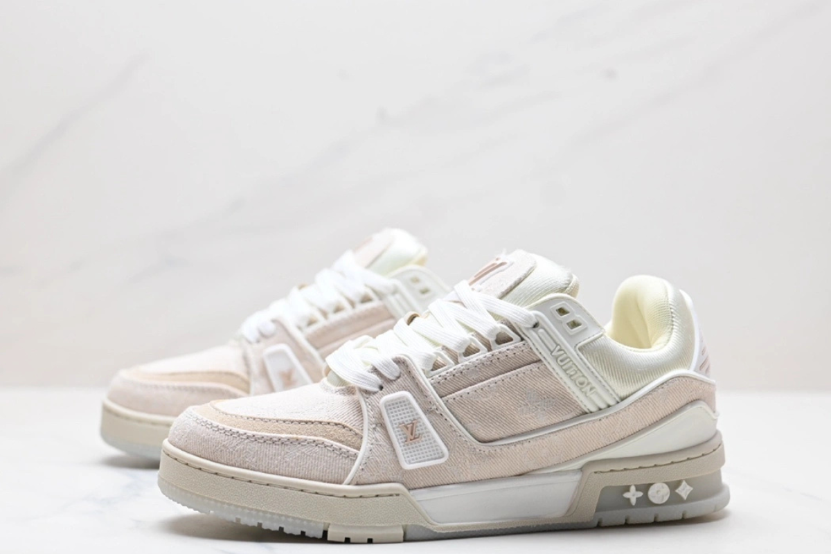 The Louis Vuitton LV Trainer Sneaker in Beige features a premium blend of materials, including monogram-textured textile and smooth leather. Designed for both comfort and luxury, it combines classic streetwear style with the iconic elegance of Louis Vuitton branding.