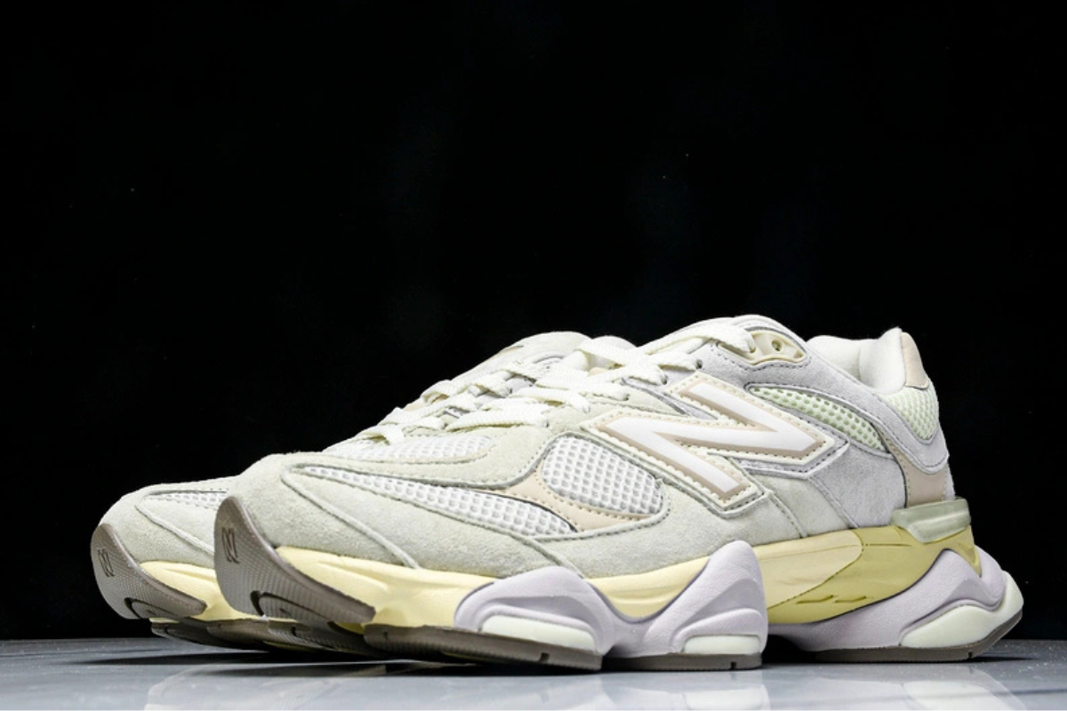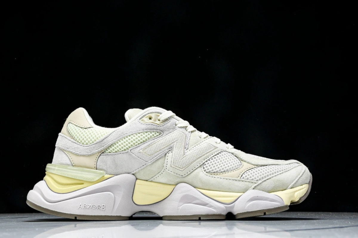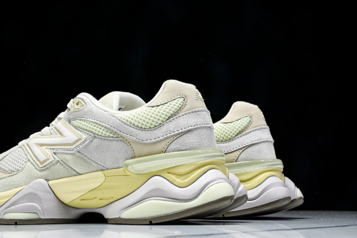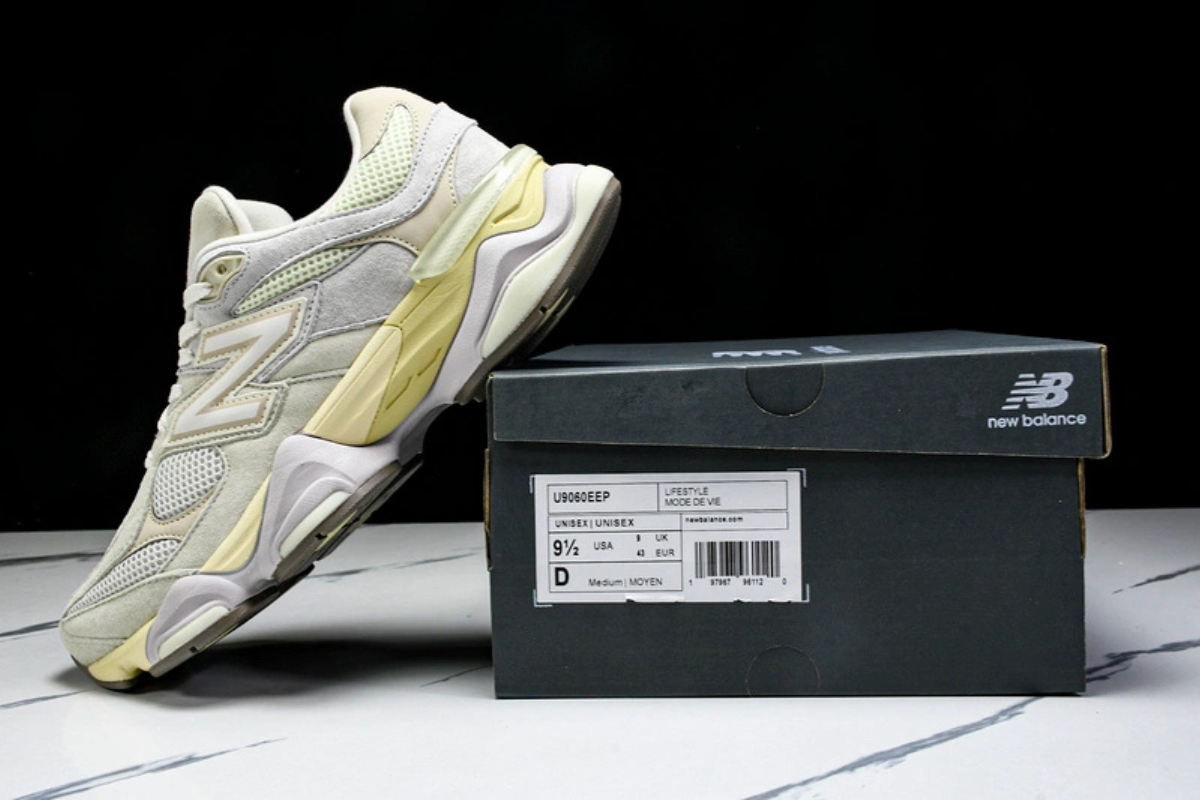The New Balance 9060 Grey/Light Yellow combines retro-futuristic design with soft, airy tones. Featuring a suede and mesh upper in light grey with subtle yellow accents, it delivers style and comfort through ABZORB cushioning and a sculpted chunky midsole—perfect for everyday wear.