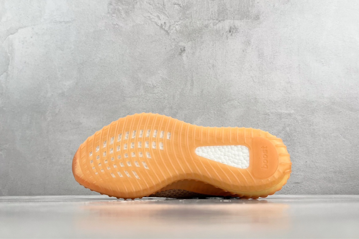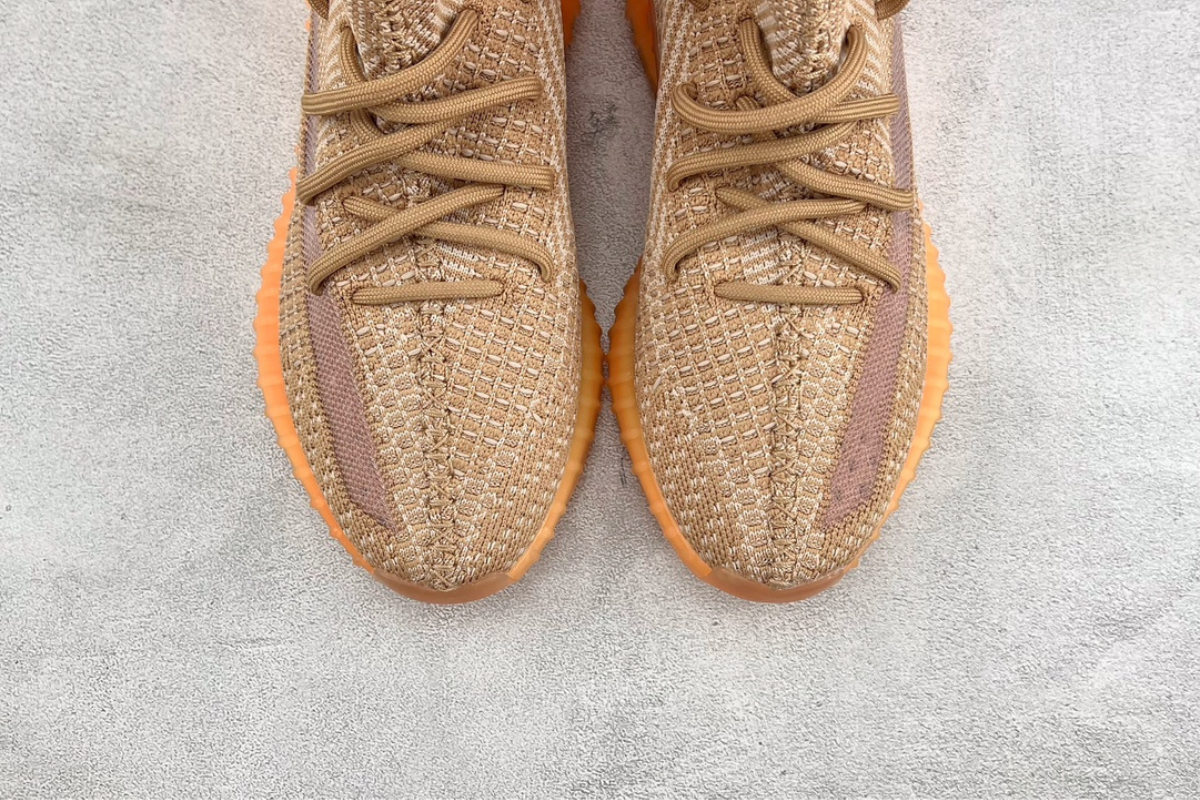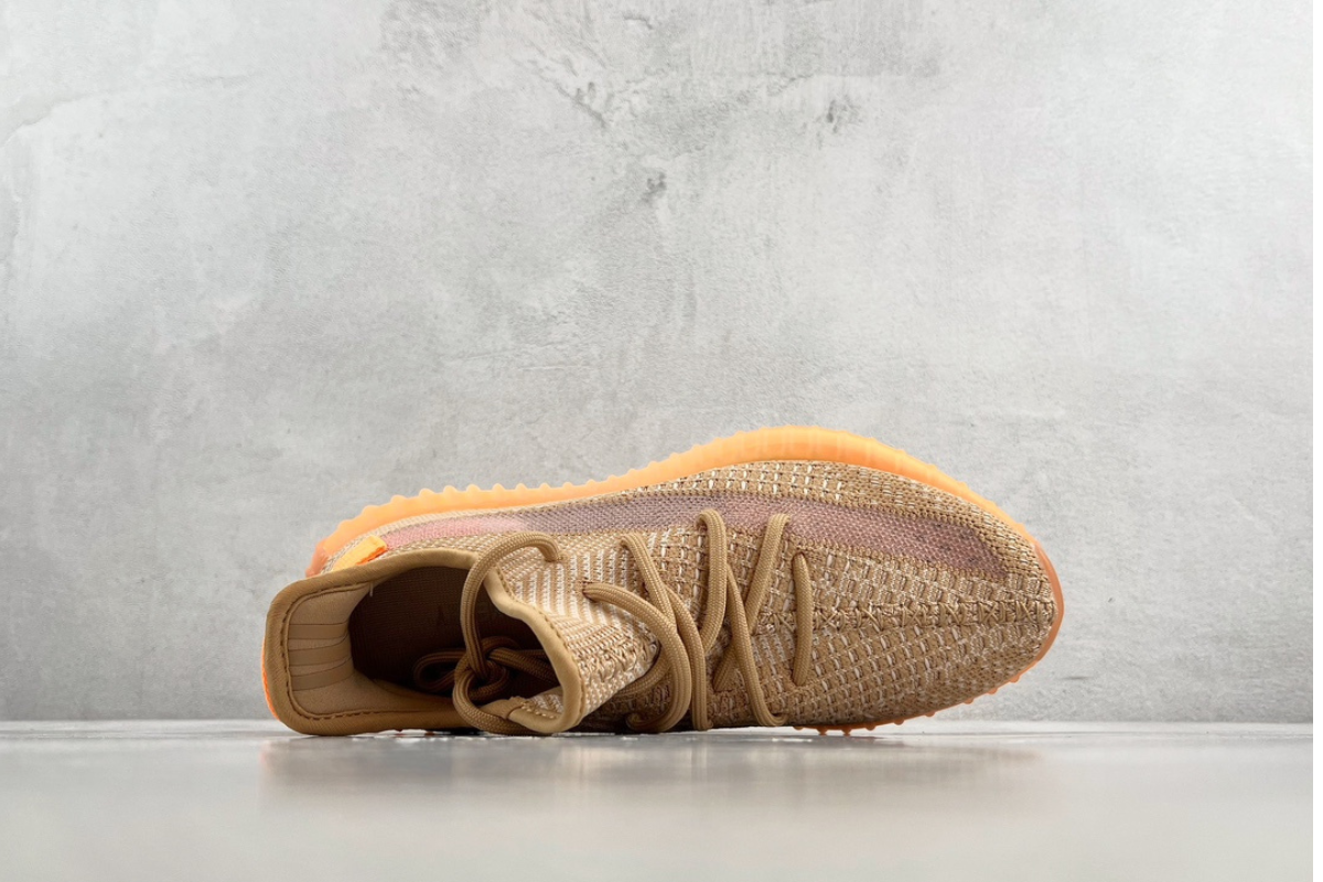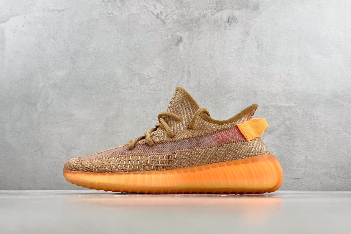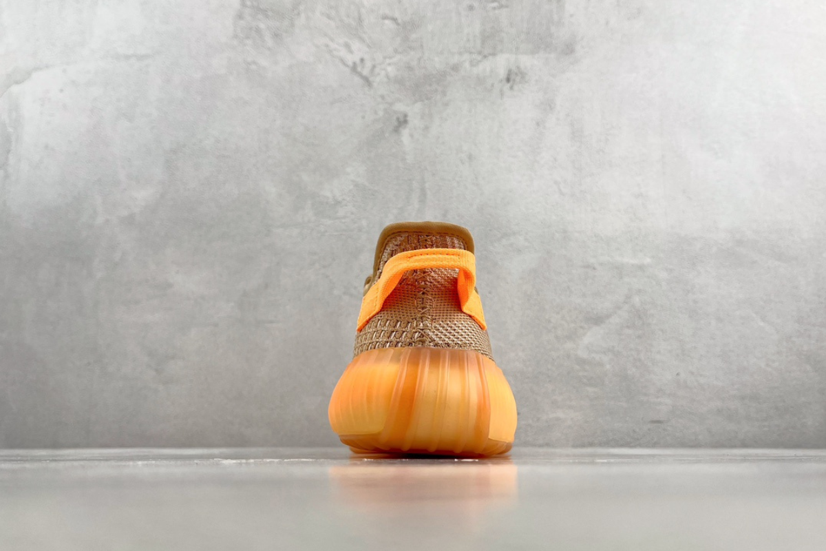 This is the Adidas Yeezy Boost 350 V2 "Clay," featuring a tan Primeknit upper, signature translucent stripe, and a vibrant orange heel tab and sole. A stylish blend of comfort and standout design.